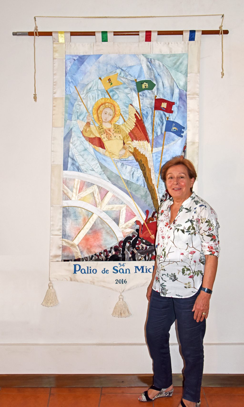 Il Consiglio Direttivo dell’Ente Palio ha approvato la comunicazione ufficiale della 54° Edizione del Palio de San Michele, che si terrà a Bastia Umbra da sabato 17 settembre a giovedì 29 settembre 2016. Il presidente dell’Ente Palio, Marco Gnavolini ha presentato il Palio 2016 realizzato dall’artista Maria Caldari, ex docente di Educazione artistica nella Scuola Media di Bastia Umbra. L’artista da vari anni si dedica alla realizzazione di ceramiche e ed arazzi, calando la sua cultura, la sua abilità e la sua passione per il bello in opere dal fascino tutto particolare. Quella degli arazzi è un’arte che comunica il desiderio di volare lontano nel tempo di voler raggiungere una dimensione passata, una realtà distante dal mondo contemporaneo, ma vicina al desiderio di interpretarla in modo nuovo e comunicarla visivamente attraverso il linguaggio artistico.
