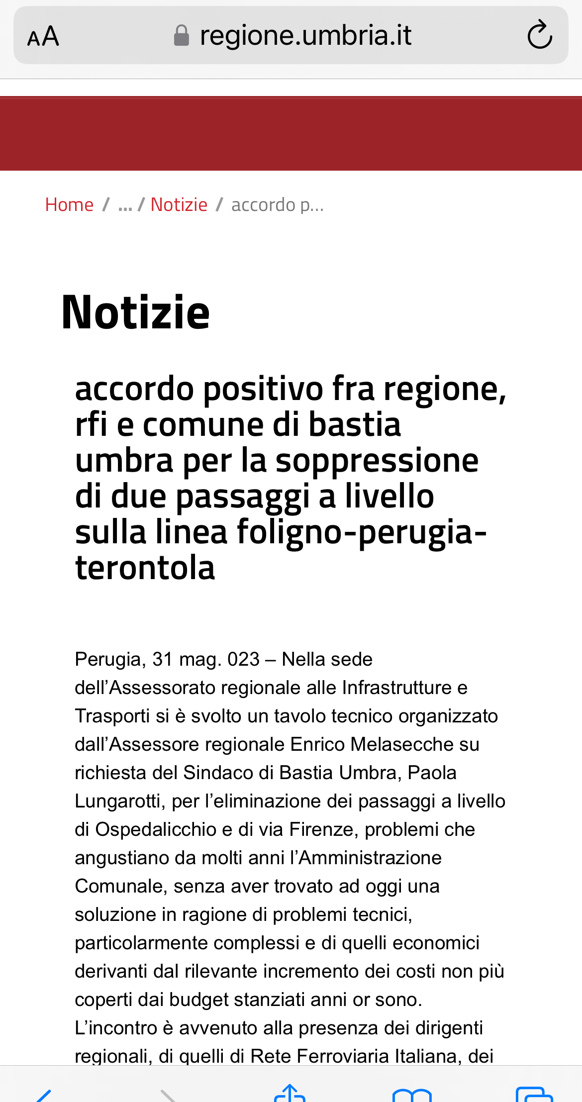 Ci domandiamo allora come mai proprio un anno fa veniva sbandierato, come da comunicato ufficiale della Regione Umbria di seguito riportato del 31 maggio 2023, un accordo positivo fra regione, RFI e Comune di Bastia in tal senso. L’accordo era stato annunciato come il primo passo per sbloccare la situazione ormai incancrenita da anni. Ricordiamo infatti che questa amministrazione aveva sul precedente programma la realizzazione del sottopasso di Via Firenze, che si poteva eseguire grazie proprio alla forte sinergia tra regione e comune di Bastia, considerata l’appartenenza alla stessa forza politica.