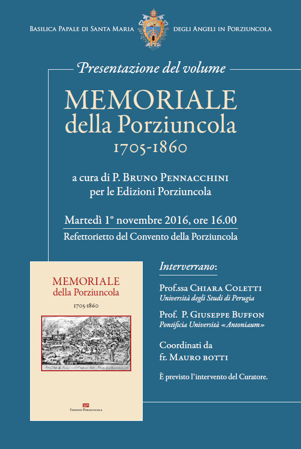 Martedì 1° novembre 2016, alle ore 16.00 ci sarà – presso il Refettorietto del Convento della Porziuncola – la presentazione del doppio volume “MEMORIALE della Porziuncola 1705-1860” realizzato per le Edizioni Porziuncola a cura di p. Bruno Pennacchini OFM. I due Tomi riportano i due volumi manoscritti dell’archivio conventuale della Porziuncola, con le memorie del Santuario, del Convento e del primitivo abitato di Santa Maria degli Angeli, nel piano di Assisi, dal 1705 al 1860; vera e preziosa fonte di documenti risalenti fino al secolo XV.