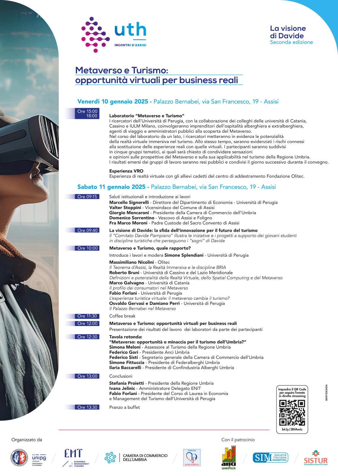 Nella giornata di sabato 11 gennaio, incentrata sul rapporto tra Metaverso e truismo e sulle varie opportunità per business reali, i saluti istituzionali saranno portati da Marcello Signorelli, Direttore del Dipartimento di Economia UniPg, con Valter Stoppini, Vicensindaco del Comune di Assisi e Giorgio Mencaroni, Presidente della Camera di Commercio dell’Umbria. Inoltre, saranno presenti anche Domenico Sorrentino, Vescovo di Assisi e Foligno e Fra Marco Moroni – Padre Custode del Sacro Convento di Assisi.