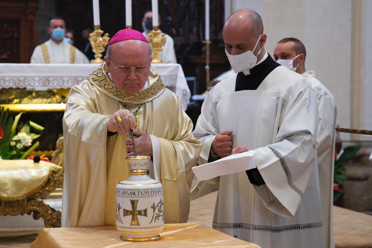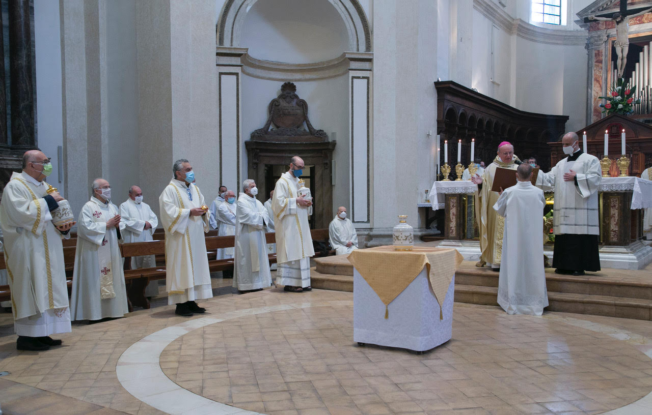 ell’omelia il vescovo ha anche sottolineato l’importanza di questa celebrazione dopo la lunga quarantena e il lockdown. “Finalmente ci ritroviamo – ha affermato -. Abbiamo condiviso e condividiamo la sofferenza di tante persone e famiglie. La nostra vita liturgica ne è stata profondamente segnata. Non nascondiamo di avere sofferto anche perché il nostro servizio è stato considerato solo alla stregua di un pericolo e non anche della dimensione di risorsa, quale poteva essere ed è, ovviamente alla condizione della più severa disciplina nella quale eravamo e continuiamo ad essere responsabilmente impegnati. La gioia della Pasqua è stata come velata e violata. Non ci sembra vero di poterla recuperare oggi, con questo ponte ideale tra la Passione e la Pentecoste. Abbiamo chiesto in tanti modi misericordia. Oggi la imploriamo ancora perché il futuro è tutt’altro che certo”.
