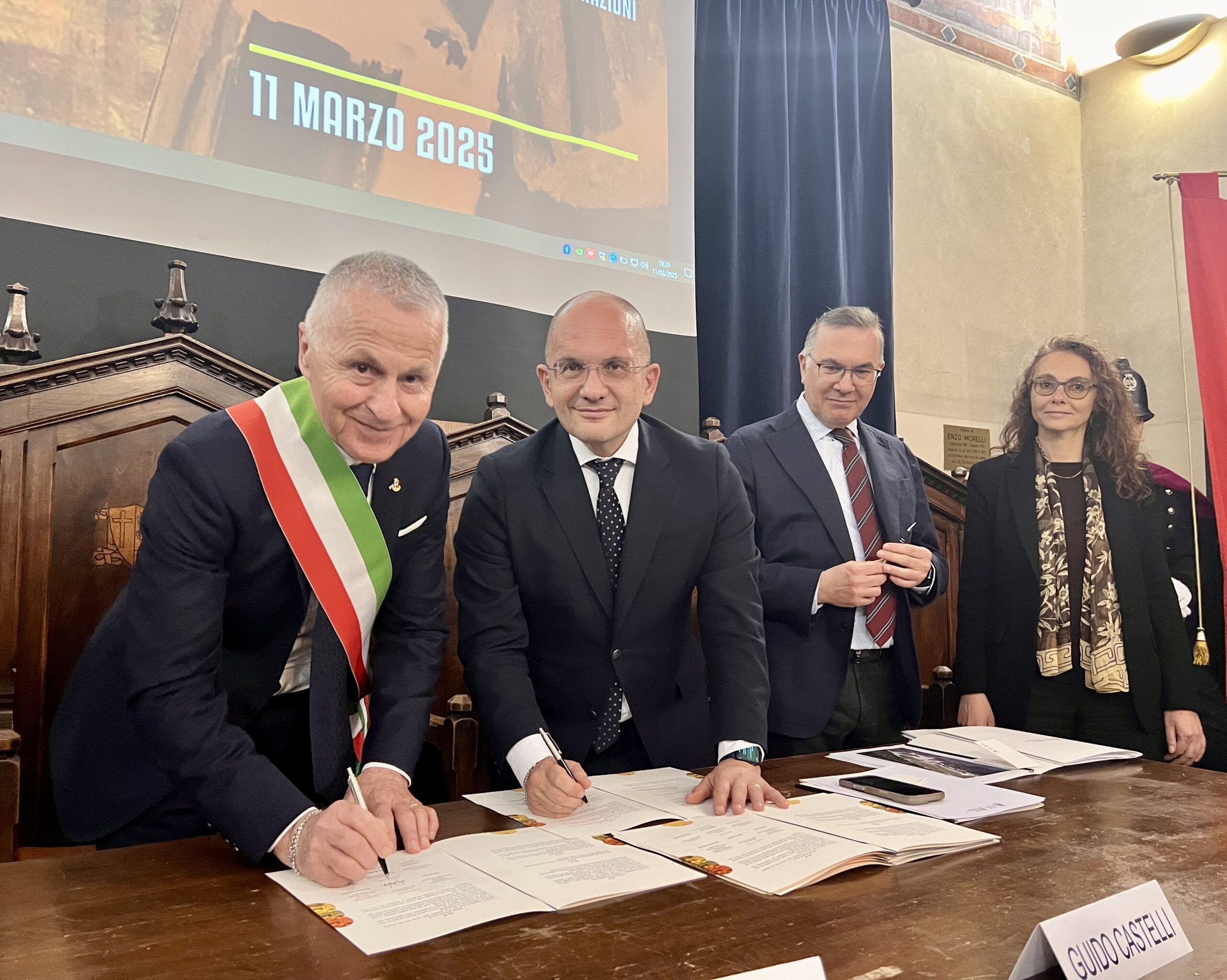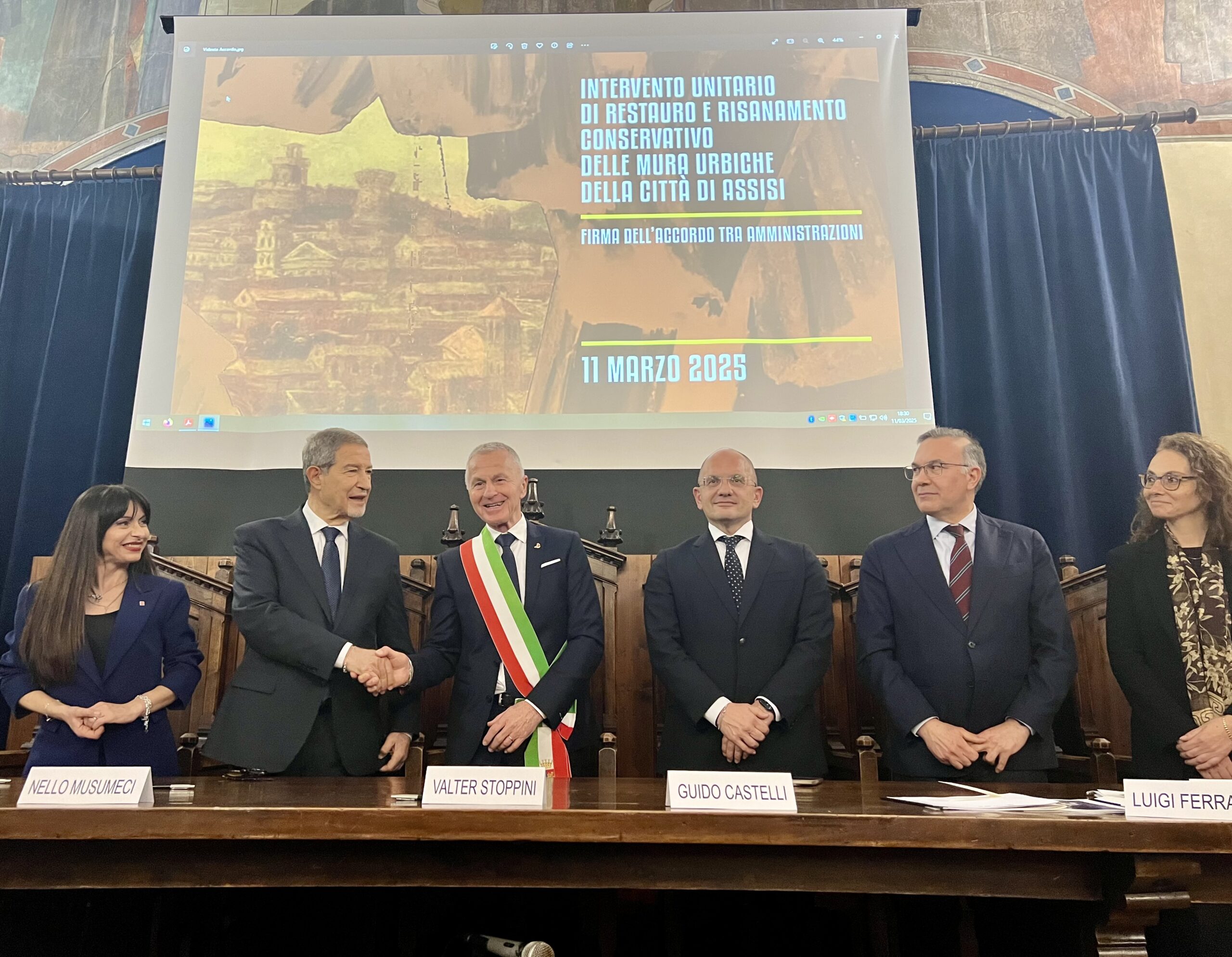 Assisi, 12/03/2025 – Le mura urbiche di Assisi, parco lineare urbano unico nel suo genere che vanta oltre 2mila anni di storia, verranno restaurate e valorizzate grazie a un progetto di riqualificazione promosso dal Comune nel 2022 e finanziato con contributo statale di 9,5 milioni di euro, attraverso un accordo di programma con Governo e Soprintendenza archeologica, Belle Arti e Paesaggio dell’Umbria. L’intesa è stata sottoscritta l’11 marzo 2025, nella Sala della Conciliazione del palazzo comunale della città serafica, da Valter Stoppini, sindaco f.f. di Assisi, Luigi Ferrara, capo Dipartimento Casa Italia – Presidenza del Consiglio dei Ministri e Francesca Valentini, dirigente delegata Soprintendenza Archeologica, Belle Arti e Paesaggio dell’Umbria. All’evento sono intervenuti anche Nello Musumeci, ministro per la Protezione civile e le Politiche del mare, Stefania Proietti, presidente della Regione Umbria, Guido Castelli, commissario straordinario del Governo per la riparazione e la ricostruzione sisma 2016.