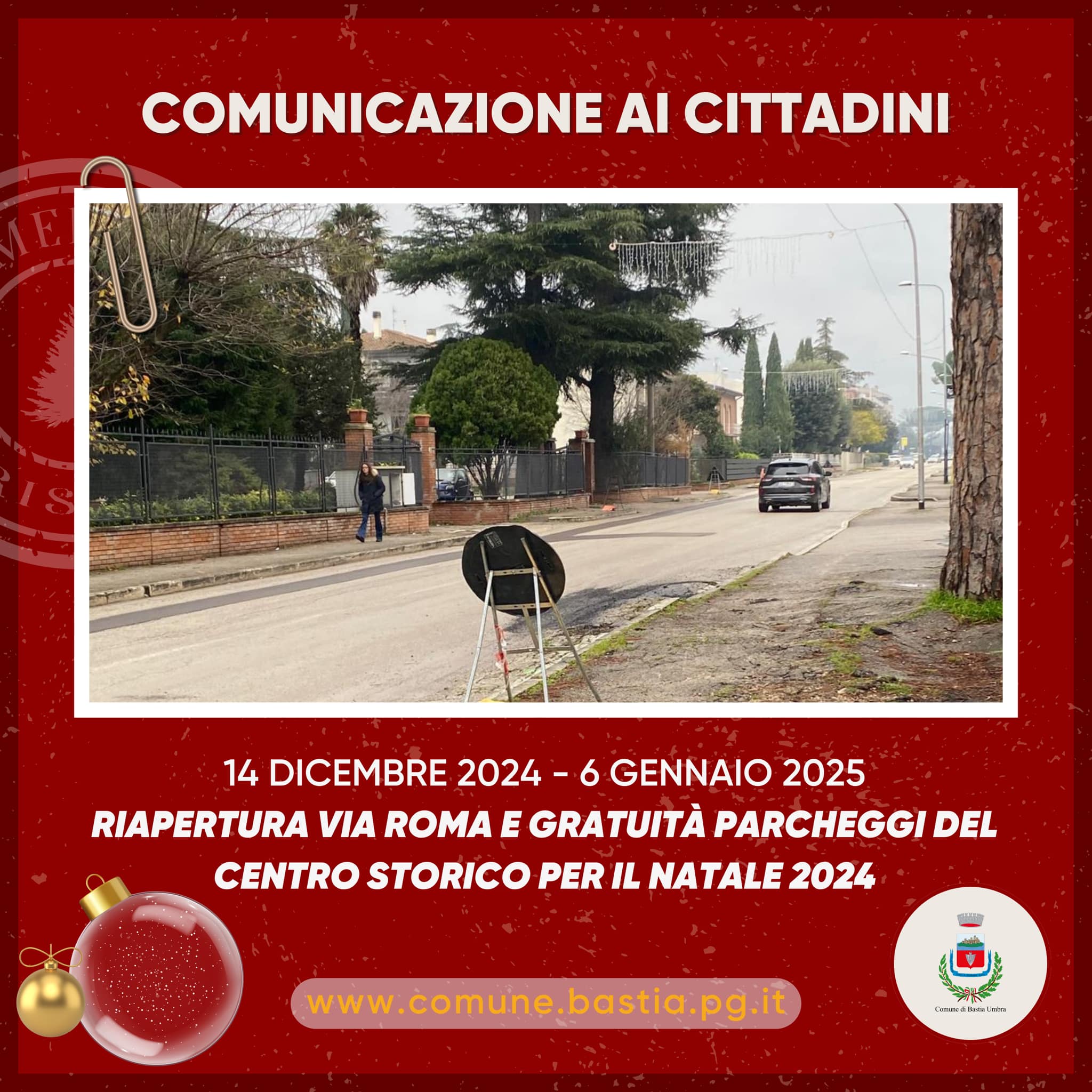NATALE 2024 – RIAPERTURA VIA ROMA E PARCHEGGI GRATUITI A BASTIA UMBRA FINO AL 6 GENNAIO 2025.