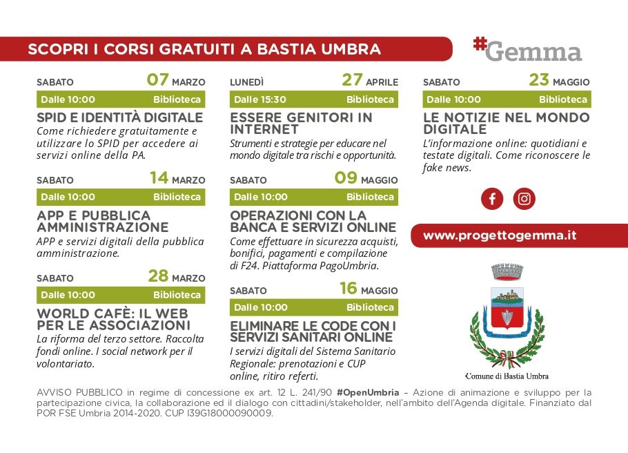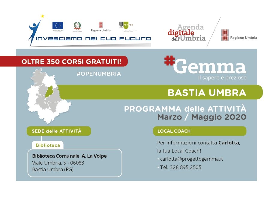 In Biblioteca Comunale “Alberto La Volpe” di Bastia Umbra, il programma gratuito di animazione digitale finanziato dalla Regione Umbria, finalizzato ad accrescere il benessere delle persone e la cultura digitale in Umbria. Primo appuntamento il 7 marzo alle ore 10.00 con “SPID e identità digitale: Come richiedere gratuitamente e utilizzare lo SPID per accedere ai servizi online della Pubblica Amministrazione. Sei le Zone Sociali coinvolte, Bastia Umbra appartiene alla Zona Sociale 3. Il progetto Gemma infatti è un programma gratuito di animazione digitale finanziato dalla Regione Umbria con le risorse del POR-FSE 2014-2020 per permettere ai cittadini e alle cittadine di tutte le età di accrescere le proprie competenze digitali facilitando anche le attività quotidiane con la Pubblica amministrazione. Riduce il divario del sapere digitale degli over 65, sostenendo l’uso di tecnologie per la comunicazione, PC, Internet, applicazioni digitali, in una comunità digitale che coinvolge giovani, anziani e associazioni in interventi di innovazione sociale. Accresce il grado di utilizzo di internet nelle famiglie e promuovere un uso consapevole dei social media nei giovani. Incentiva l’accesso ai servizi digitali dedicati a imprese e lavoratori.Di seguito tutti i corsi gratuiti per i cittadini a Bastia Umbra presso la Biblioteca Comunale Alberto La Volpe, dal 7 marzo fino al 23 maggio.