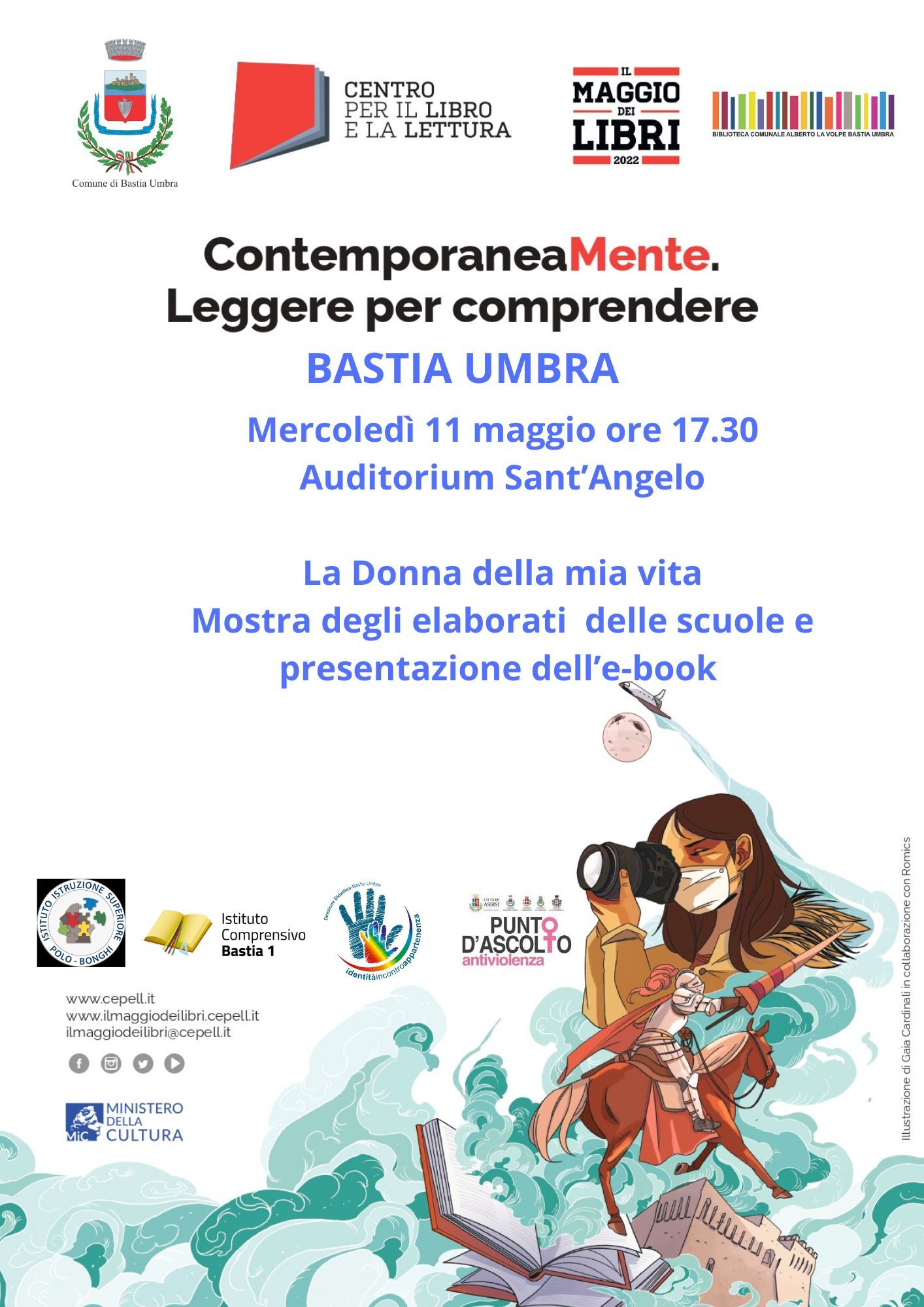 Il primo appuntamento di questa settimana Mercoledì 11 maggio alle ore 17.30 con la mostra e la presentazione dell’E Book :” La Donna della mia vita” raccolta degli elaborati grafici e letterari del concorso che è stato indetto in occasione della Giornata Internazionale della Donna, dal Tavolo Pari Opportunità del Comune di Bastia Umbra e RAV, al quale hanno partecipato le Scuole del territorio. Una “raccolta” dei lavori di tanti bambini e bambine, ragazzi e ragazze, del loro grande impegno dal profondo impatto culturale e artistico sulla parità di genere e sulle pari opportunità.