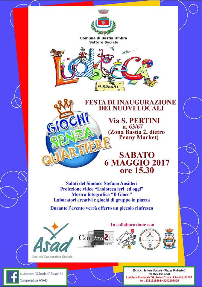 In occasione della cerimonia di inaugurazione e apertura della nuova sede della Ludoteca Comunale, sabato 6 maggio, nella zona di Bastia 2 via Sandro Pertini, la strada compresa tra la piazza e i fabbricati, sarà chiusa al traffico veicolare, dalle ore 14 alle 20. Il programma delle cerimonia prevede infatti che, dopo gli interventi all’interno della Ludoteca, operatori sociali e bambini usciranno sulla pazza adiacente per dare vita ad una serie di manifestazioni e giochi.