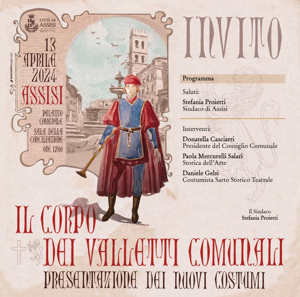 L’Amministrazione ha commissionato, dopo oltre 30 anni ed in vista dell’Ottavo Centenario Francescano, lo studio dei nuovi costumi per gli Araldi e i Valletti Comunali, a Daniele Gelsi, esperto costumista di sartoria storica e medievale. Un modo questo per custodire la preziosa eredità del passato, rinnovandola nella fedeltà alle origini e con il coraggio del futuro, valorizzando storia e tradizione che sono patrimonio comune di tutti gli abitanti e le genti di Assisi. I ‘prototipi’ sartoriali saranno presentati in un momento di confronto, riflessione e partecipazione che vuole stimolare la riflessione collettiva su questo simbolo identitario della città.