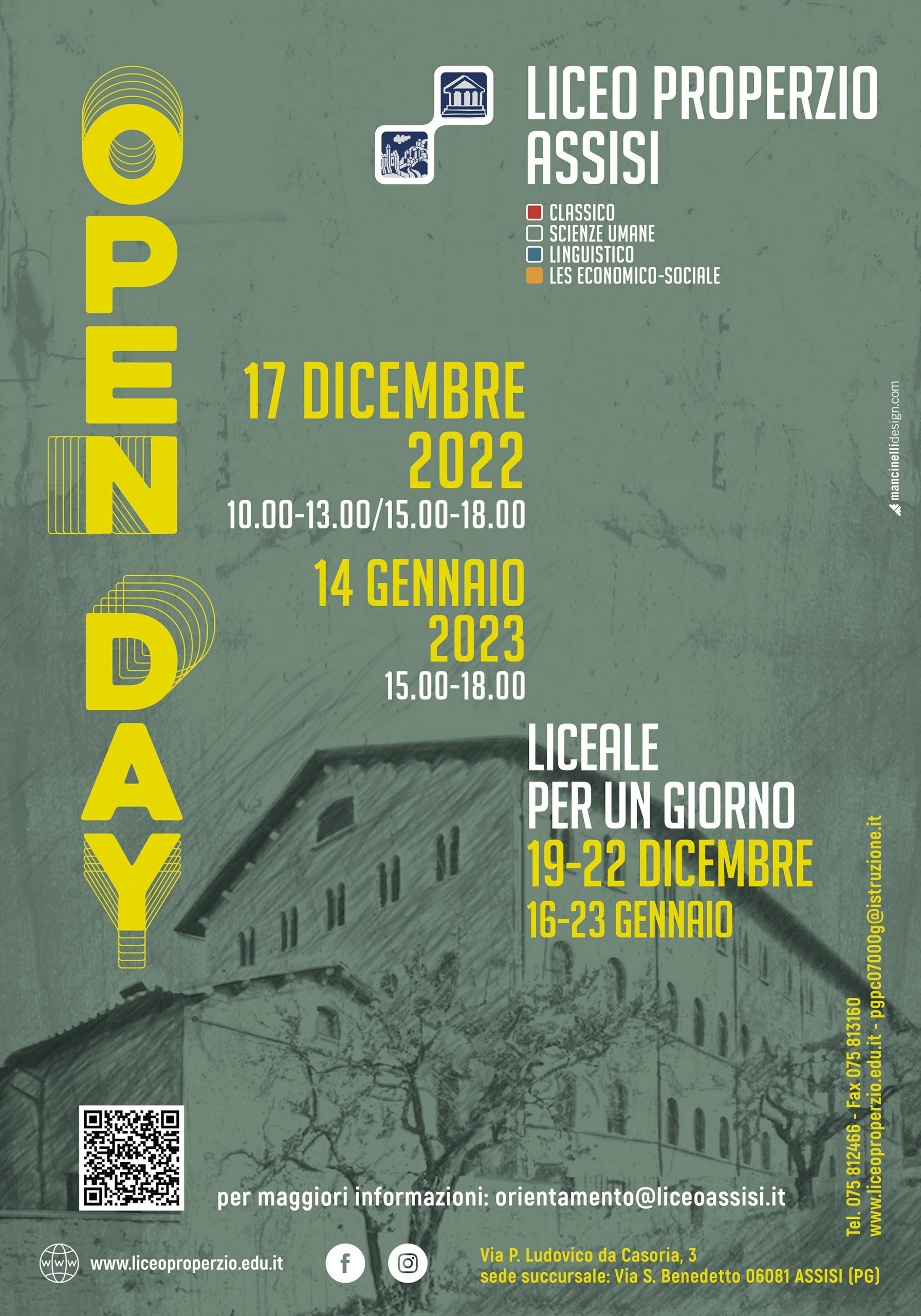 Per quanto riguarda invece Liceale per un giorno, l’iniziativa è in programma dal 19 al 22 dicembre 2022 e dal 16 al 23 gennaio 2023: questa iniziativa è dedicata agli studenti dell’ultimo anno della scuola secondaria di I grado che potranno partecipare ad alcune lezioni con docenti e studenti del Liceo Properzio in orario mattutino, dalle 8:50 alle 12:40. In particolare, il 19 dicembre Liceale per un giorno sarà dedicato all’indirizzo di scienze umane, il 20 per l’indirizzo Economico – Sociale, il 21 per l’indirizzo classico e il 22 per l’indirizzo Linguistico. L’accesso è su prenotazione compilando il modulo online https://www.liceoproperzio.edu.it/pagine/liceale-per-un-giorno-2022-23-1 .