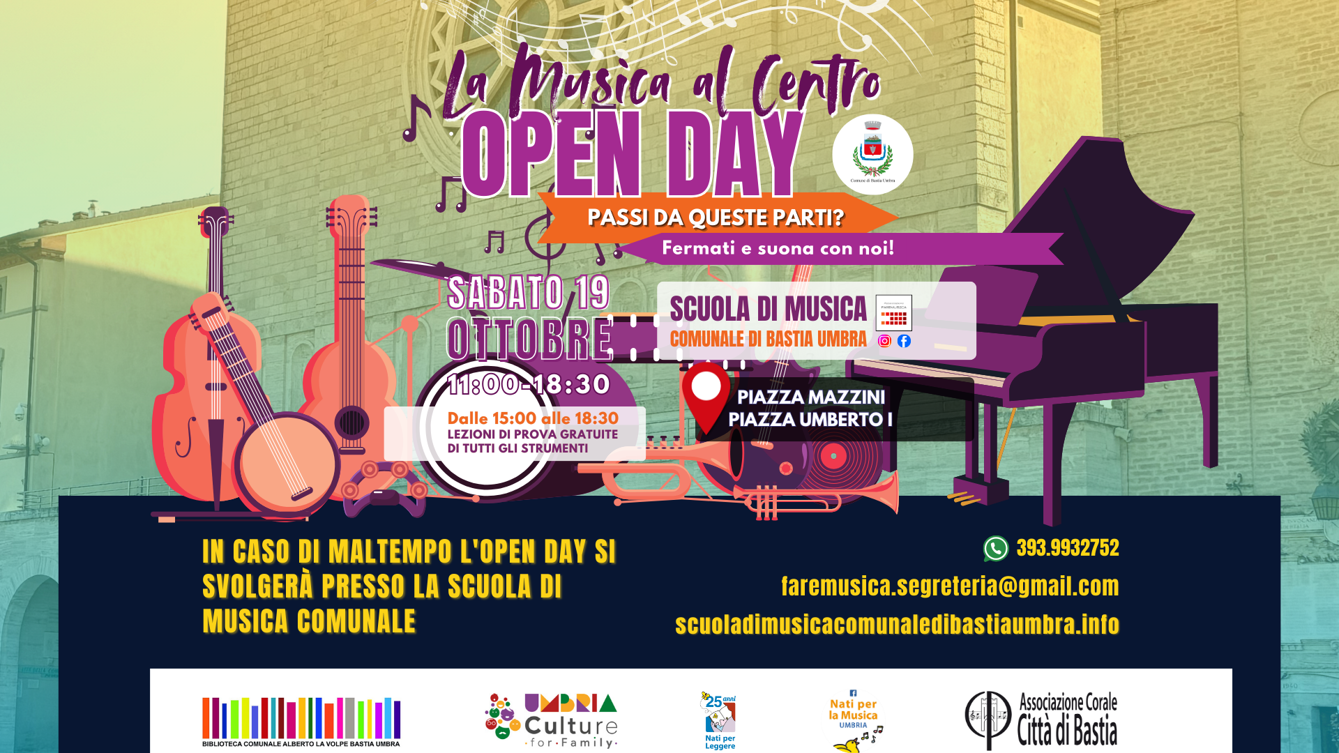 La Scuola di Musica Comunale di Bastia Umbra è lieta di annunciare il suo attesissimo Open Day, che si terrà Sabato 19 Ottobre, nelle suggestive cornici di Piazza Mazzini e Piazza Umberto I a Bastia Umbra. Questo evento offre un’opportunità unica per immergersi nel mondo della musica, fare lezioni di prova gratuite di tutti gli strumenti e scoprire la ricca offerta didattica della scuola.
