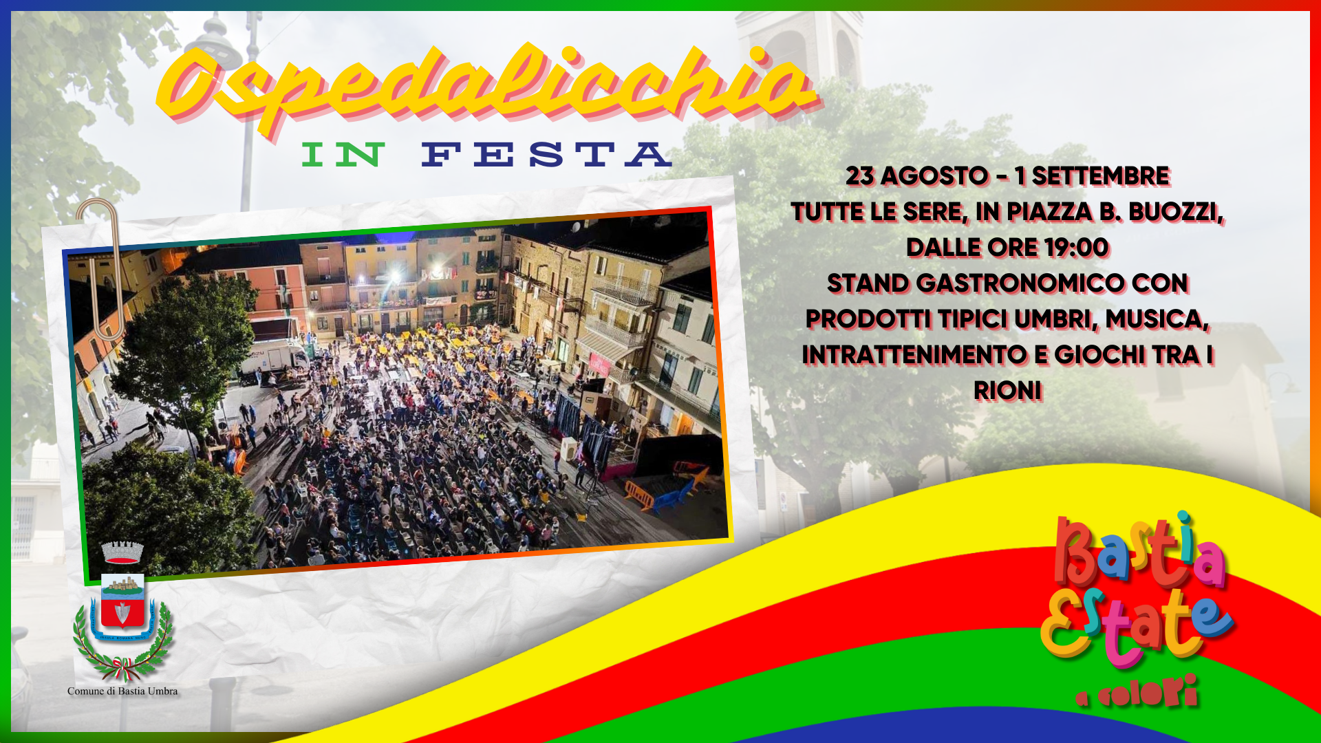 Dal 23 Agosto al 1 Settembre Ospedalicchio vi aspetta per “Ospedalicchio in Festa”, ricorrenza nata nel 1854 come Celebrazione della Madonna della Pietà, oggi gestita e promossa dall’Associazione “Comitato Festa Ospedalicchio”, Ente costituitosi ad inizio 2024 grazie al contributo di decine di volontari che ogni anno mettono a disposizione tempo ed energie per dar vita ad un’iniziativa sempre più sentita e partecipata dai cittadini del quartiere.