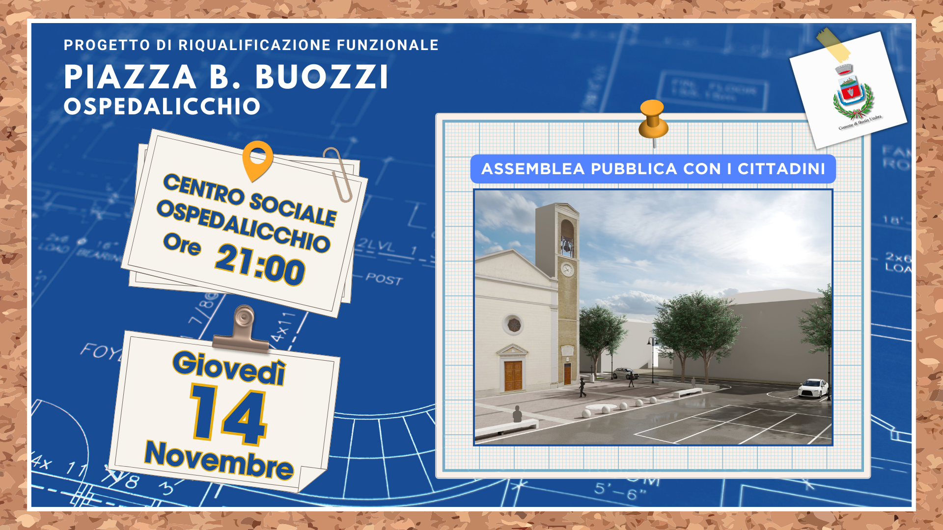 Pertanto, vi aspettiamo Giovedì 14 Novembre alle ore 21:00 presso il Centro Sociale di Ospedalicchio per illustrare e discutere il nuovo Progetto di Riqualificazione di Piazza Bruno Buozzi.