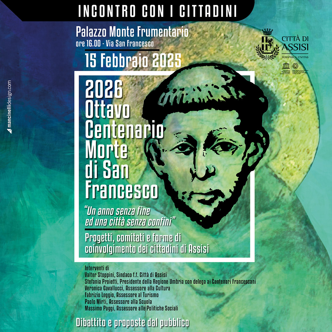 “I cittadini di Assisi – sottolinea il sindaco f.f. Valter Stoppini – saranno protagonisti dell’ottavo Centenario della morte di San Francesco e in prima linea nei festeggiamenti previsti nel 2026 per questa importante ricorrenza. L’idea è quella della massima condivisione possibile, affinché la comunità locale possa dare un contributo fattivo, rafforzando il legame con la figura di Francesco, che rappresenta radici e identità stessa della nostra città. Al tempo stesso, Assisi si troverà di fronte a importanti opportunità, che dovrà saper cogliere. Vogliamo vivere pienamente l’evento, lasciando un segno concreto e rilanciando, ancora più forti, i valori universali del messaggio francescano. Auspichiamo, quindi, un’ampia partecipazione di cittadini e realtà associative a questo primo importante incontro verso il 2026”.