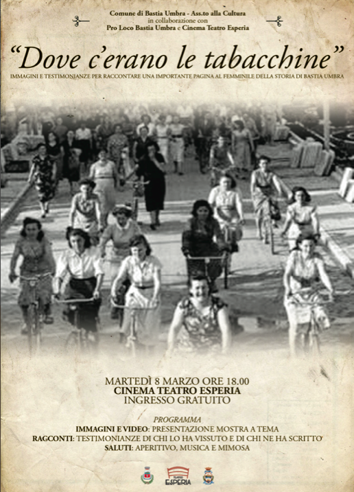 L’appuntamento con le tabacchine ed il significato del loro lavoro negli anni cinquanta/ sessanta del secolo scorso a Bastia umbra, nel tabacchificio Giontella di viale Roma, sarà al centro dell’incontro al cinema Esperia il prossimo otto marzo, ore 18.00.