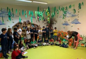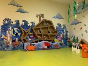 Disposta nell’atrio situato tre le due ali della scuola, questa scena tridimensionale sarà utilizzata come biblioteca o angolo di lettura a partire dal prossimo anno scolastico.