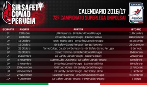 Tra le date da cerchiare in rosso al PalaEvangelisti il 9 ottobre, esordio casalingo contro Padova, il primo novembre, quando verranno a Perugia i campioni in carica di Modena e nel 2017 i match contro Trento (il 15 gennaio), contro Civitanova (5 febbraio) e contro Verona (il 26 febbraio).