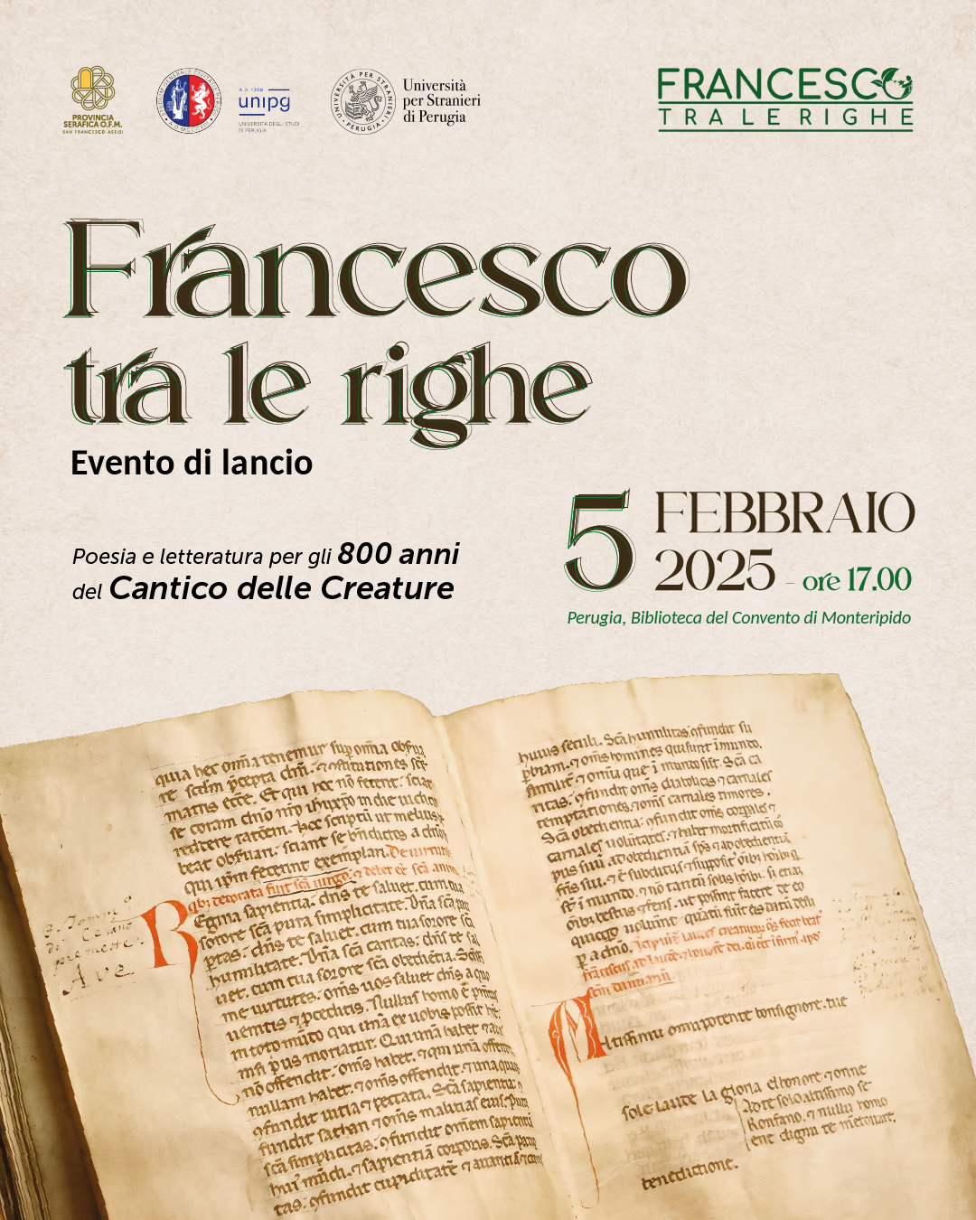 Primo straordinario evento di Francesco tra le righe è a San Damiano, il 26 febbraio, con la lettura del Cantico in 30 lingue con le voci degli studenti dei due atenei perugini.