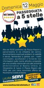 • Domenica 12 maggio alle ore 15, con partenza dalla sede elettorale di Bastia, in piazza Mazzini, 77, i cittadini del Movimento 5 Stelle passeggeranno insieme ai concittadini  per le vie del nostro centro cittadino. Sara l’occasione per incontrarci e parlare del  nostro programma elettorale e conoscere il nostro candidato Sindaco Laura Servi e tutta la squadra dei consiglieri M5S. Saranno presenti alla manifestazione itinerante i vari parlamentari M5S tra cui Filippo Gallinella, presidente della Commissione Agricoltura  alla Camera dei Deputati. Al termine ritorno presso la sede elettorale previsto per le ore 19 con conviviale organizzata dal gruppo M5S Bastia. Il 26 maggio CAMBIA VOLTO A BASTIA, vota Movimento 5 Stelle Bastia.