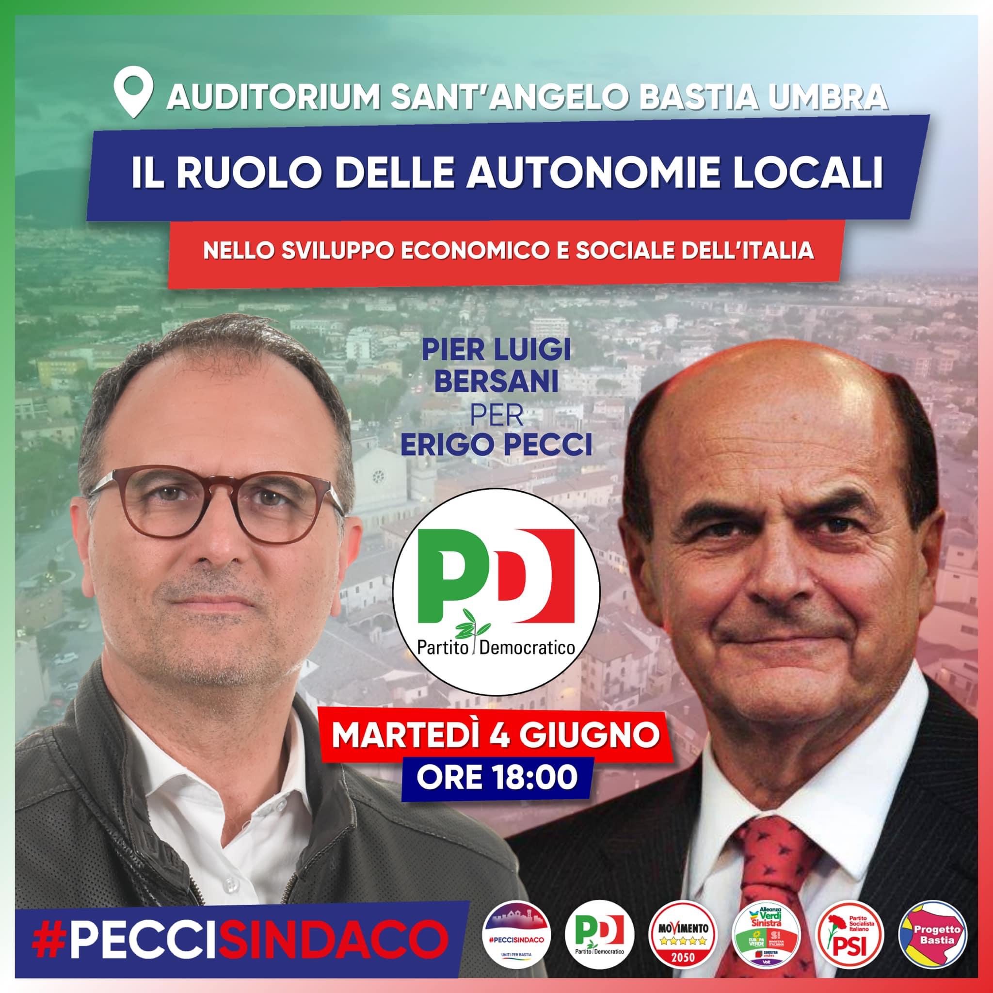 Il PD di Bastia Umbra invita tutta la cittadinanza a partecipare all’evento di domani 4 giugno ore 18 presso l’Auditorium. Avremo la soddisfazione di accogliere l’Onorevole Pierluigi Bersani. Il tema dell’iniziativa sarà il ruolo delle Autonomie locali nello sviluppo economico e sociale del Paese. Siamo al rush finale di questa campagna elettorale: abbiamo speso tanta energia in questa campagna elettorale e domani ne daremo l’ennesima prova. La segreteria, il gruppo consiliare e la lista dei candidati del PD Bastia vi aspettano, a domani.
