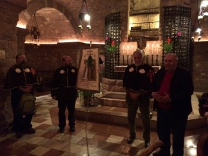 Alla partenza un momento molto emozionante e di profonda spiritualità: la Tomba di San Francesco il luogo scelto nel quale il Vescovo di Perugia Mons. Paolo Giulietti ha impartito la benedizione ai pellegrini augurando loro il “buon cammino” che si svolgerà in piena settimana santa.