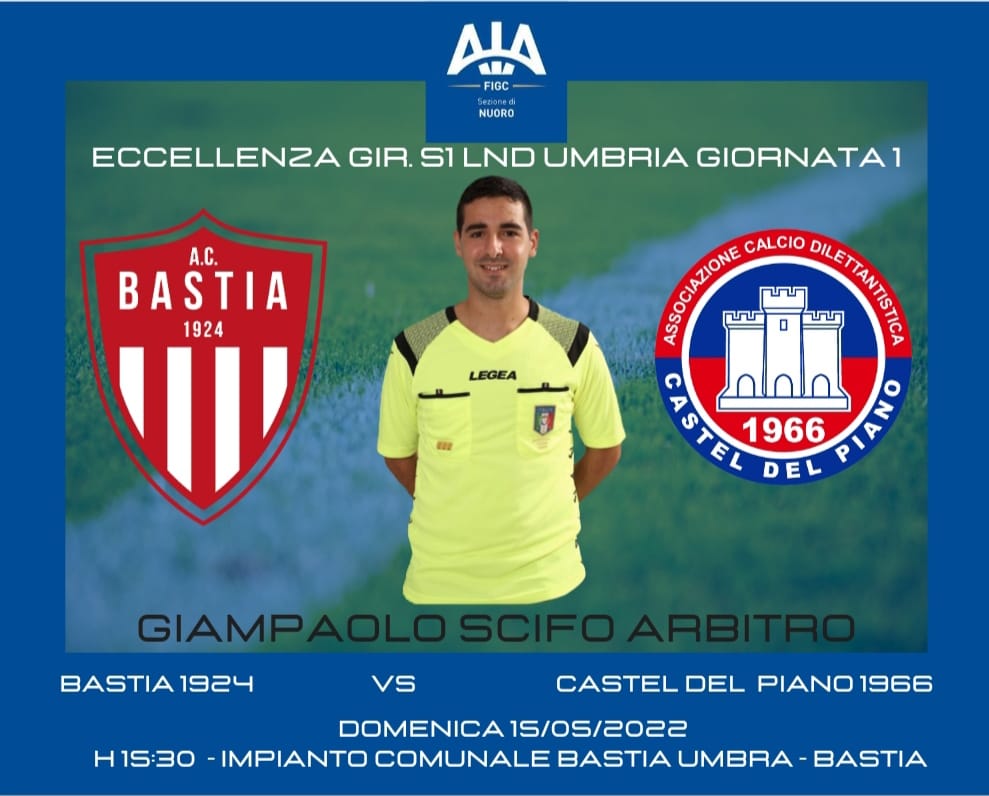 BASTIA UMBRA – Ad arbitrare la prima partita dei play-out, Bastia 1924 vs Castel Del Piano, in calendario domenica 15 Maggio (ore 15:30) allo stadio Carlo Degli Esposti, sarà il signor Giampaolo Scifo della sezione di Nuoro. Sarà assistito nell’occasione da Mohamed Ben Boubaker e Elia Costantini entrambi della sezione di Foligno.