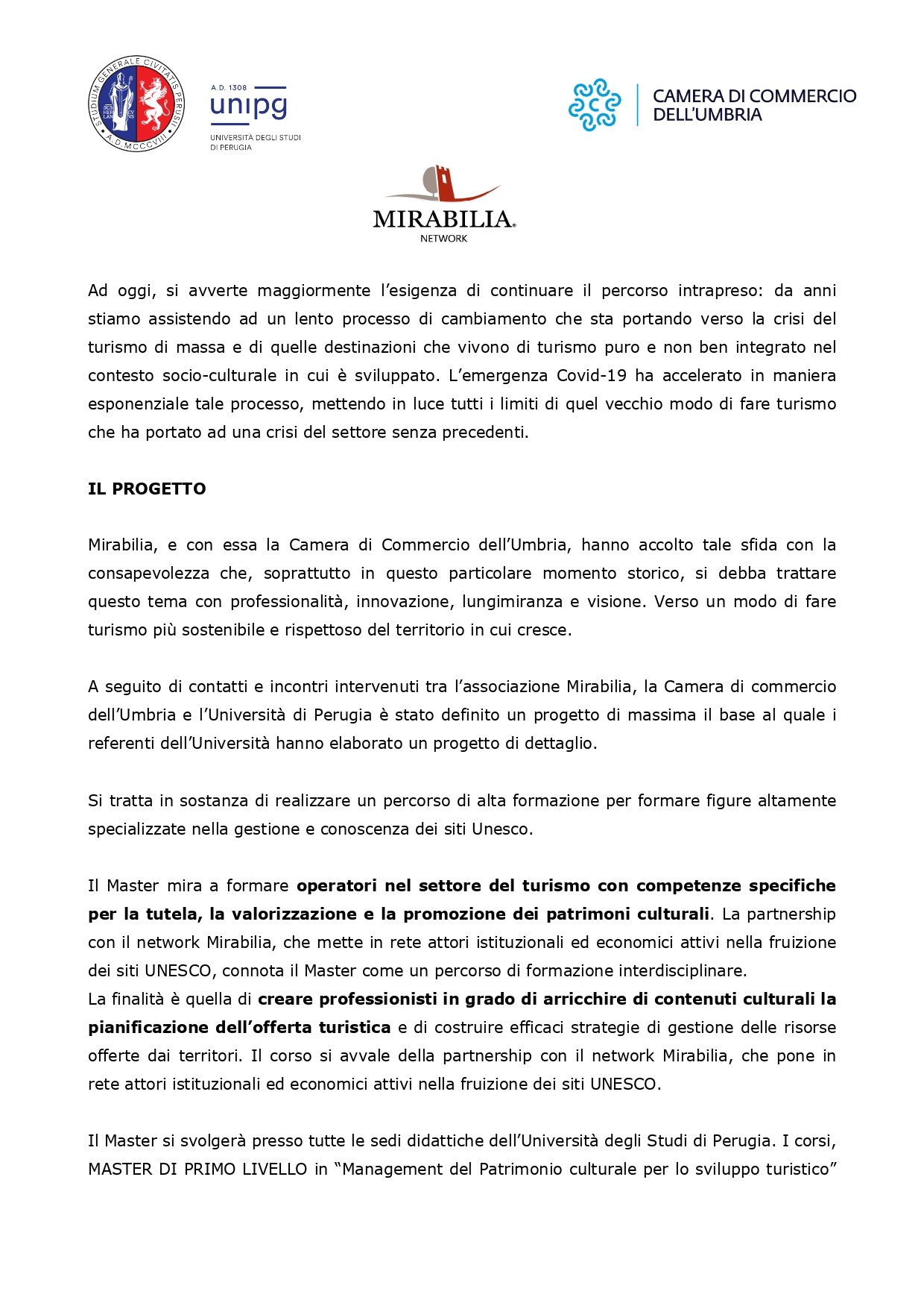 Sottolineando la rapidità con cui si è passati dall’ideazione dell’iniziativa formativa alla sua  realizzazione operativa, grazie anche all’impegno del Delegato Rettorale Professore Daniele Parbuono, il Presidente della Camera di Commercio dell’Umbria Giorgio Mencaroni ha evidenziato come “Il progetto master in ‘Management del Patrimonio culturale per lo sviluppo turistico’, pensato e attuato da Università degli Studi e Mirabilia Network, con il sostegno della Camera di Commercio dell’Umbria, nasce dalla consapevolezza che, soprattutto in questo particolare momento di emergenza sanitaria globale, il tema del turismo debba essere trattato con alta professionalità, capacità di innovazione, visione d’insieme e lungimiranza. Pensando ad un modo nuovo di fare turismo, più sostenibile e rispettoso del territorio in cui cresce. Le figure professionali in uscita dal master saranno in grado di elaborare strategie di valorizzazione e promozione turistico-culturale, di valutare e verificare la fattibilità tecnica e socio-economica delle iniziative, di coordinare e gestire progetti di marketing territoriale, per migliorare la competitività di un’area geografica e del suo sistema socio-economico.”