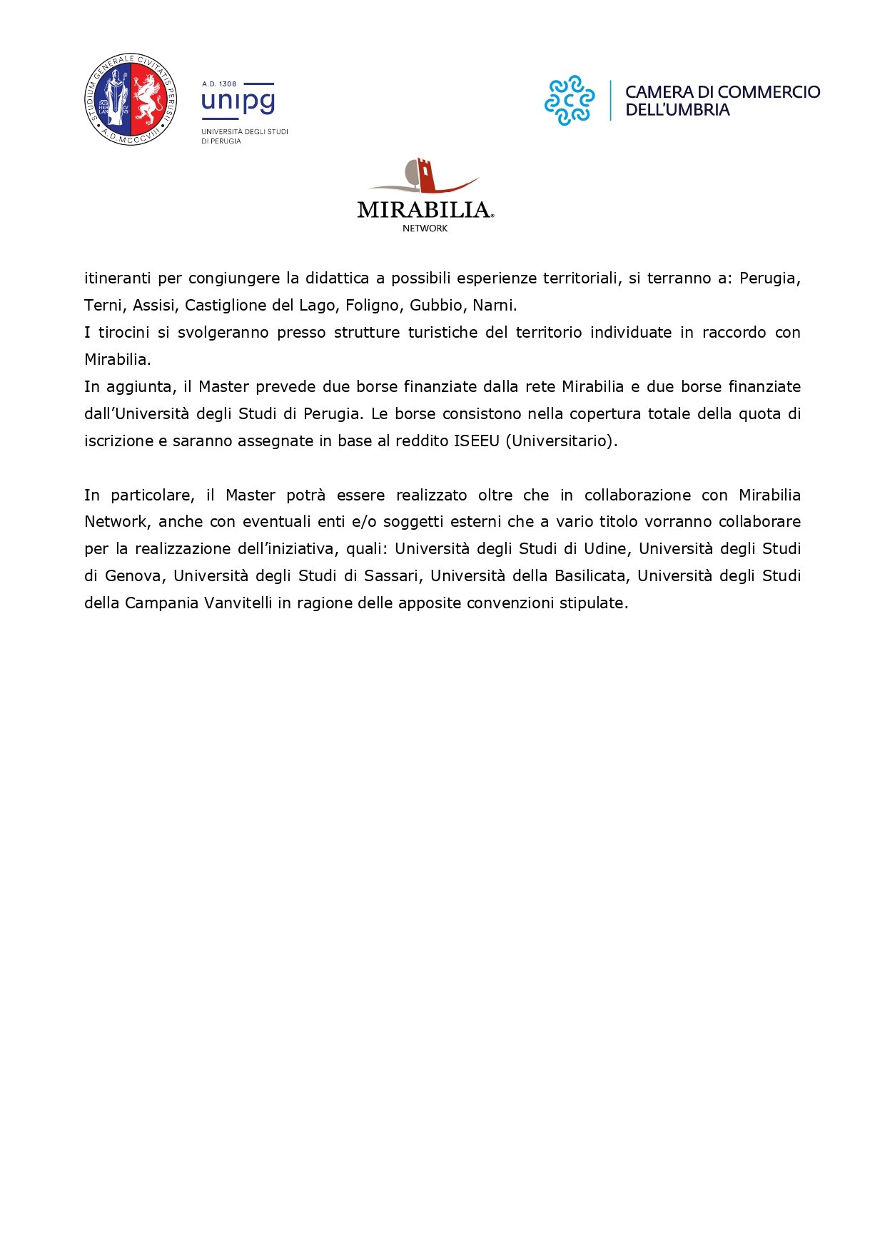 Il Master metterà a disposizione due borse di studio finanziate dalla rete Mirabilia e due finanziate dall’Università degli Studi di Perugia.