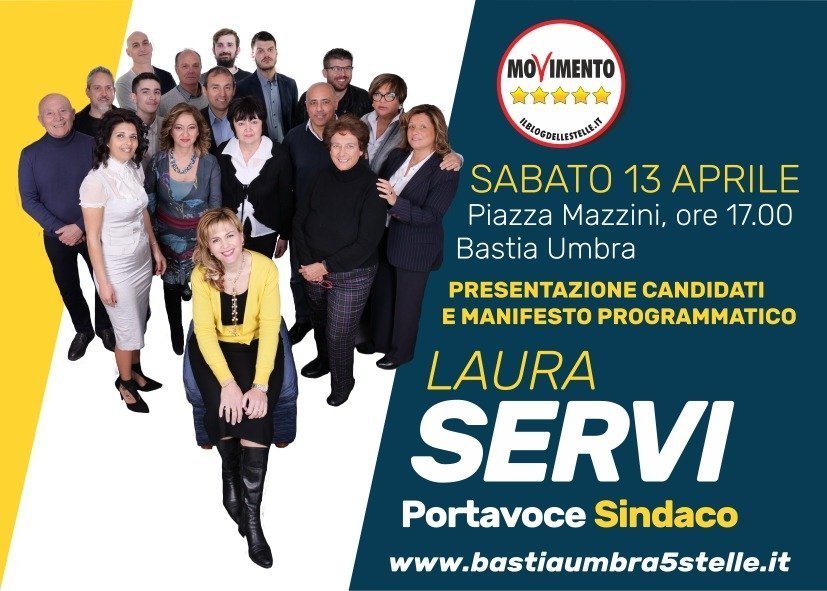 Sabato 13 aprile alle ore 17, in piazza Mazzini 77, verrà presentato alla cittadinanza il Candidato Sindaco del Movimento 5 Stelle di Bastia Umbra Laura Servi, insieme a tutta la squadra dei 16 consiglieri pentastellati, alla presenza dei Consiglieri Regionali Andrea Liberati, Maria Grazia Carbonari e di gran parte dei parlamentari umbri del M5S. Al termine seguirà un aperitivo offerto dal gruppo degli attivisti del M5S Bastia e, per tutti coloro che vorranno partecipare, termineremo la serata con una cena conviviale di autofinanziamento. Per info e prenotazioni si prega di contattare il seguente numero 335 6762953.