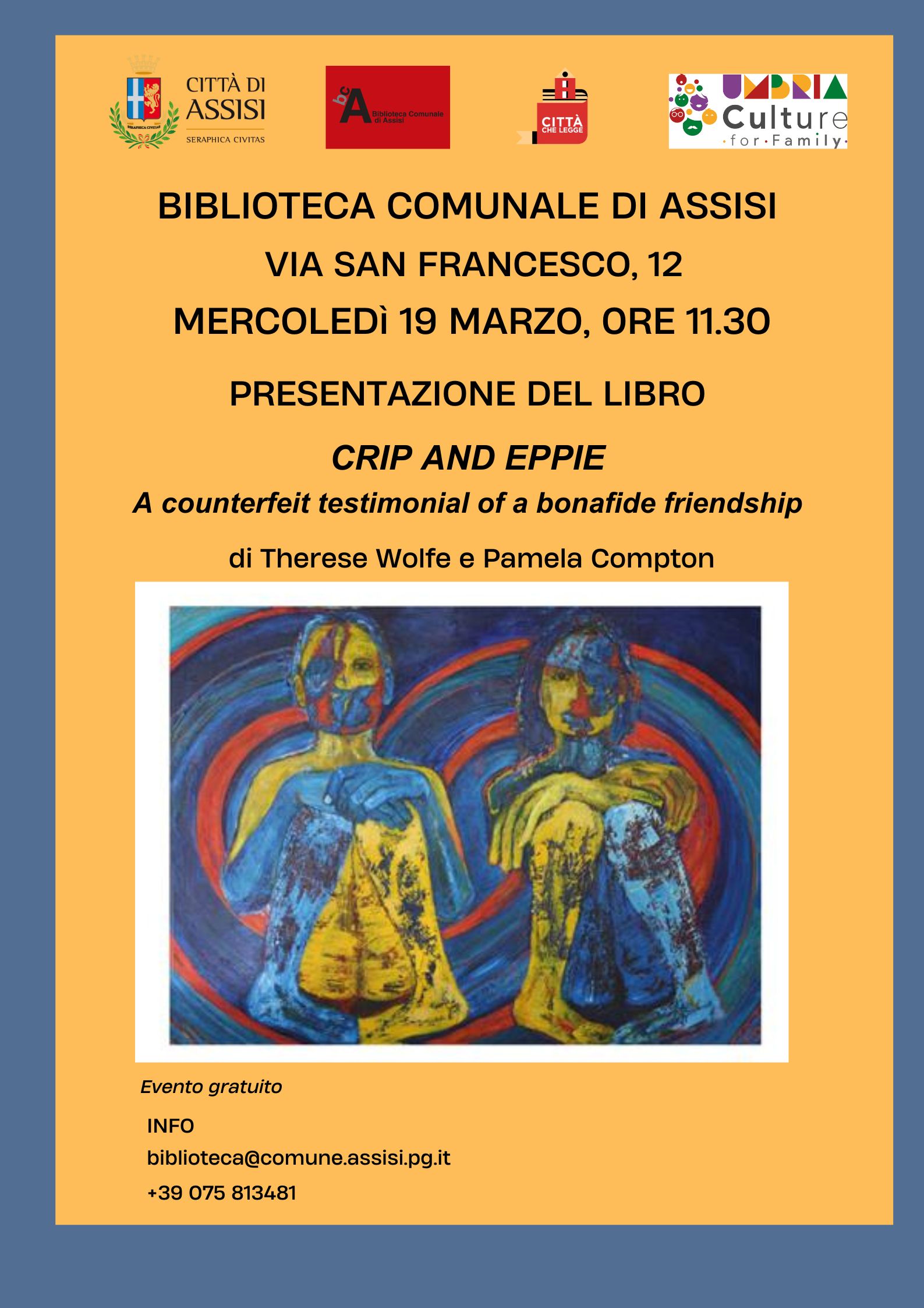 Assisi,14/03/2025 – La Biblioteca Comunale di Assisi invita tutte e tutti alla presentazione del libro “Crip and Eppie – A counterfeit testimonial of a bonafide friendship” di Therese Wolfe e Pamela Compton.