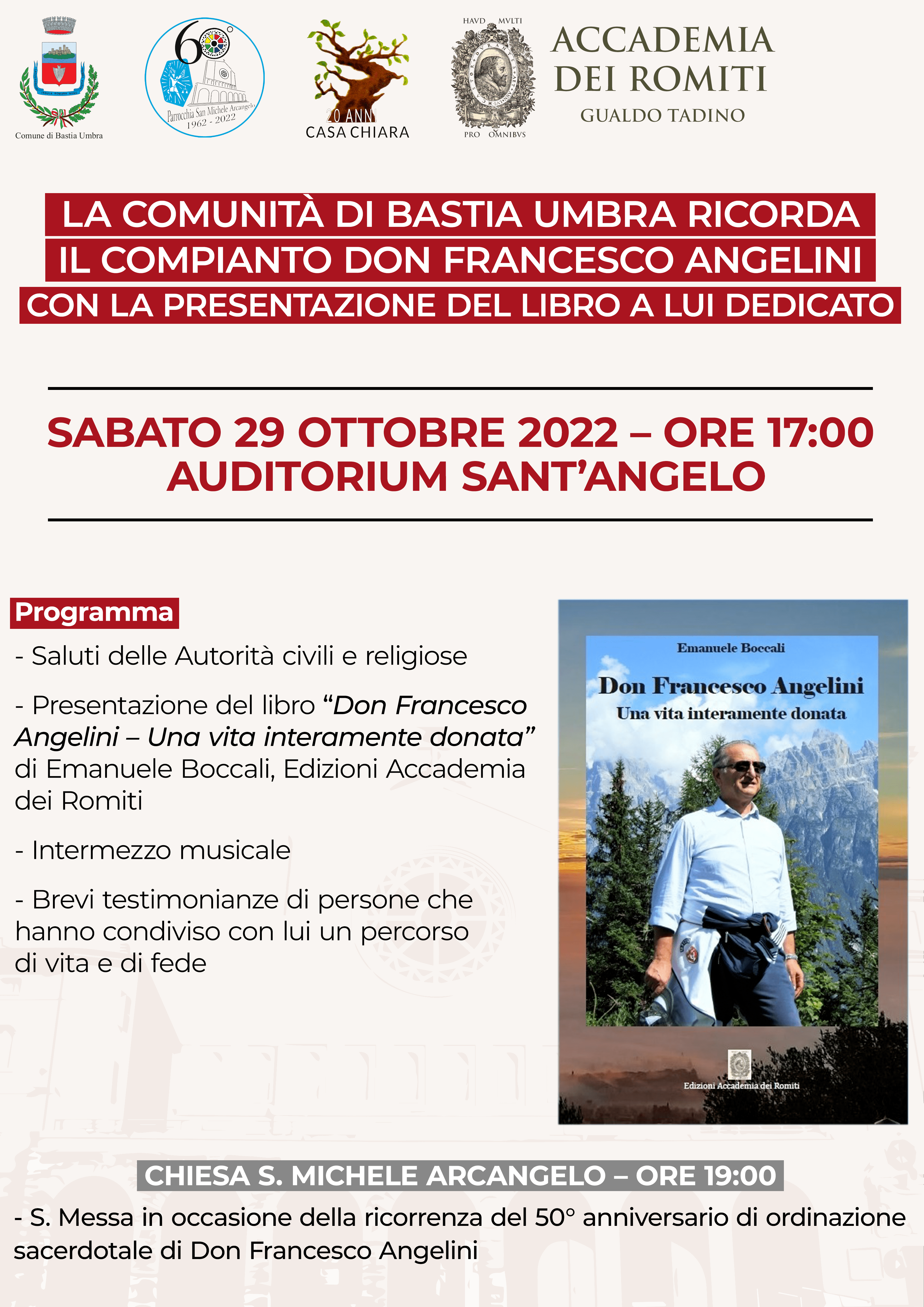 Sarà presentato a Bastia Umbra  Sabato 29 Ottobre il libro  “Don Francesco Angelini. Una vita interamente donata” di Emanuele Boccali,  Ed. Accademia dei Romiti