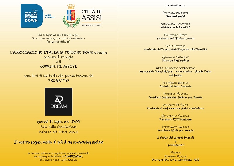 Il Comune di Assisi e l’Associazione italiana persone down (Aipd) organizzano per giovedì 11 luglio, nella Sala della Conciliazione, a partire dalle 18, un evento incentrato sulla presentazione del progetto “Dream Ap”.