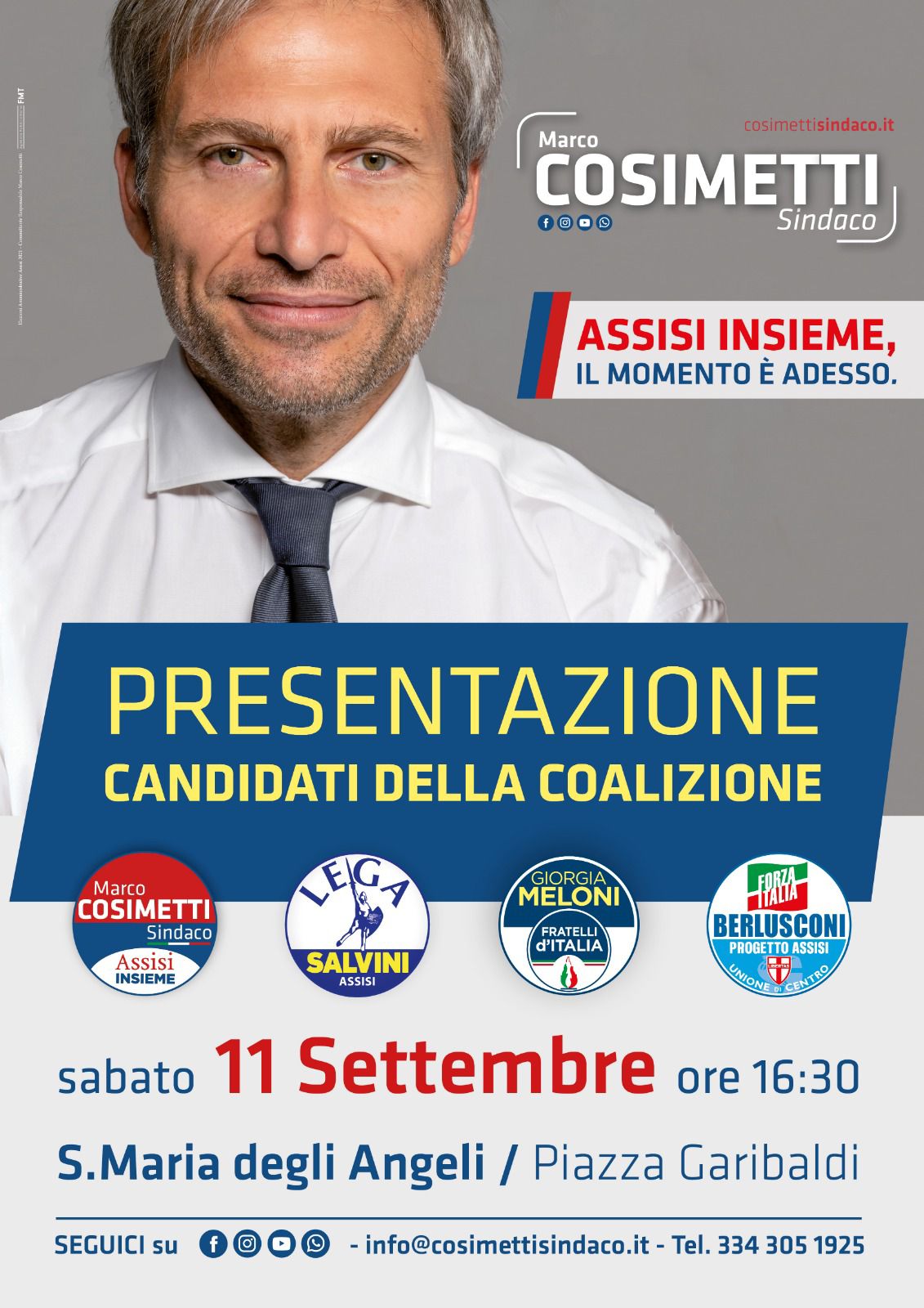Sabato 11 settembre, alle ore 16.30, in piazza Garibaldi a Santa Maria degli Angeli si terrà la presentazione ufficiale di tutti i candidati delle quattro liste che compongono la coalizione che esprime la candidatura a sindaco di Marco Cosimetti. Nell’occasione sono previsti gli interventi dei coordinatori regionali di Forza Italia e Fratelli d’Italia, Andrea Romizi e Franco Zaffini, e del consigliere regionale Stefano Pastorelli per la Lega.