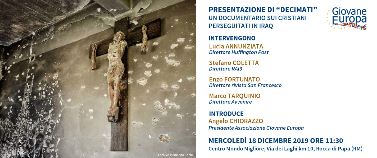 Verrà presentato, mercoledì 18 dicembre alle 11.30, nel centro di accoglienza “Mondo Migliore” il documentario sui cristiani perseguitati in Iraq: “Decimati” che verrà trasmesso su RAI3. Alla conferenza stampa parteciperanno il direttore di RAI3, Stefano Coletta, il direttore dell’Huffington Post, Lucia Annunziata, il direttore di Avvenire, Marco Tarquinio, il direttore della rivista San Francesco, padre Enzo Fortunato, e il presidente dell’Associazione Giovane Europa, Angelo Chiorazzo, che introdurrà l’incontro.