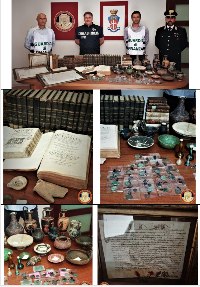Recuperati dai Carabinieri del Comando Tutela Patrimonio Culturale in collaborazione con la Compagnia della Guardia di Finanza di Perugia libri antichi e reperti archeologici d’illecita provenienza sequestrati ad un imprenditore umbro.