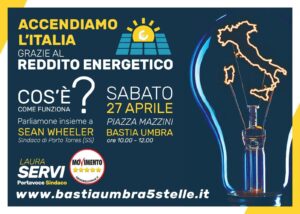 Il M5S propone anche a Bastia il reddito energetico, con il quale si propone di azzerare le bollette energetiche dei cittadini delle classi sociali più disagiate. Scoprite come verrà realizzato attraverso la testimonianza del Sindaco M5S di Porto Torres che per primo ha realizzato tale geniale provvedimento pubblico. Vi aspettiamo sabato 27 aprile dalle 10 alle 12 in piazza Mazzini 77 a Bastia Umbra.