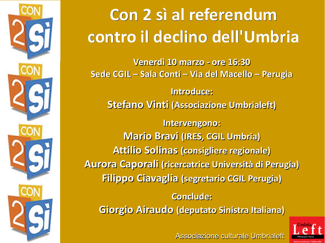 ‘Con due Si al referendum, contro il declino dell’Umbria’. È questo il titolo dell’incontro in programma venerdì 10 marzo, alle 16.30, nella sede di Perugia della Cgil, in via del Macello. L’iniziativa organizzata dall’Associazione culturale Umbrialeft si terrà nella sala Pietro Conti e sarà introdotta da Stefano Vinti in rappresentanza dell’associazione stessa. Interverranno Mario Bravi, presidente dell’Istituto ricerche economiche e sociali della Cgil Umbria, Attilio Solinas, consigliere regionale umbro, Aurora Caporali, ricercatrice dell’Università degli Studi di Perugia, e Filippo Ciavaglia, segretario provinciale della Cgil Perugia. A trarre le conclusioni sarà Giorgio Airaudo, deputato di Sinistra italiana.