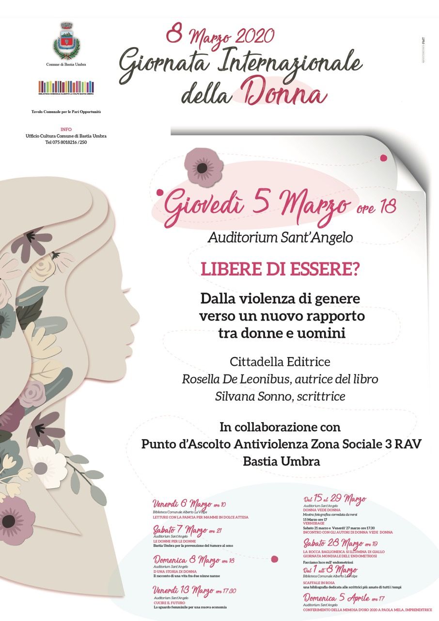 In attesa di ricevere ulteriori disposizioni ministeriali e regionali sulla precaria situazione dovuta al Covid-19, l’Amministrazione Comunale di Bastia Umbra rimanda l’iniziativa di domani giovedì 5 Marzo alle ore 18.00 presso l’Auditorium Sant’Angelo, la presentazione del libro “Libere di essere? Dalla violenza di genere verso un nuovo rapporto tra donne e uomini” di Rosella De Leonibus, Cittadella Editrice con la scrittrice Silvana Sonno, in collaborazione con Punto d’Ascolto Antiviolenza Zona Sociale 3- RAV Bastia Umbra. Provvederemo tempestivamente ad aggiornarvi sulle nuove date e ad informarvi su tutte le manifestazioni e le iniziative che afferiscono alla vita sociale e culturale della nostra città, ricordando a tutti i cittadini che si tratta di un provvedimento assunto in via precauzionale, che segue la gradualità delle informazioni tenendo conto sempre delle decisioni nazionali e della situazione locale costantemente monitorata.