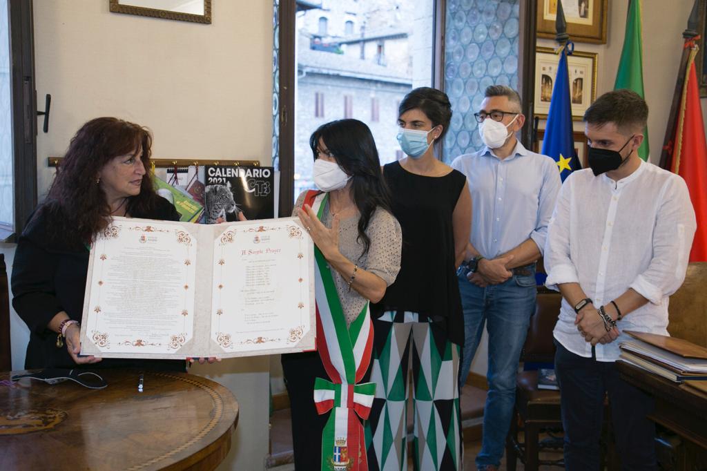 La graditissima visita di Angela è stata l’occasione per consegnarle il proclamation di congratulazioni, appositamente redatto con il prezioso aiuto dell’assessore Cavallucci, dei consiglieri Lupattelli e Sdringola e di Lucilla Locchi e Francesco Raspa dell’ufficio cultura, per il nuovo presidente degli Stati Uniti Joe Biden.