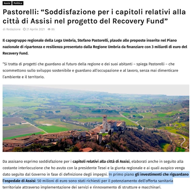 E dove sono i 50 milioni promessi per l’Ospedale di Assisi dal consigliere Pastorelli? L’ospedale di Assisi è tra quelli a cui le risorse vengono purtroppo tagliate e questo lo vedono con i propri occhi i cittadini che purtroppo ne debbono usufruire.
