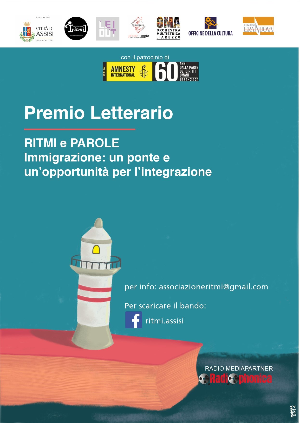 Un collettivo di voci per un concorso letterario che dia voce ai ponti per l’oggi e il domani. Nasce in centro Italia, tra Umbria e Toscana, tra Assisi e Arezzo, il Premio Letterario Ritmi e Parole, fortemente voluto da quattro associazioni dedite alla cultura nei suoi tanti valori sociali, educativi, aggregativi, comunitari e interculturali: Associazione Ritmi, Officine della Cultura, Orchestra Multietnica di Arezzo e circolo culturale “primomaggio”. Un progetto di comunicazione ambizioso che vede la collaborazione della casa editrice Edizioni Era Nuova, il patrocinio di Amnesty International Italia e Comune di Assisi, Media Partner: “Radiophonica” il Media Universitario dell’Umbria.