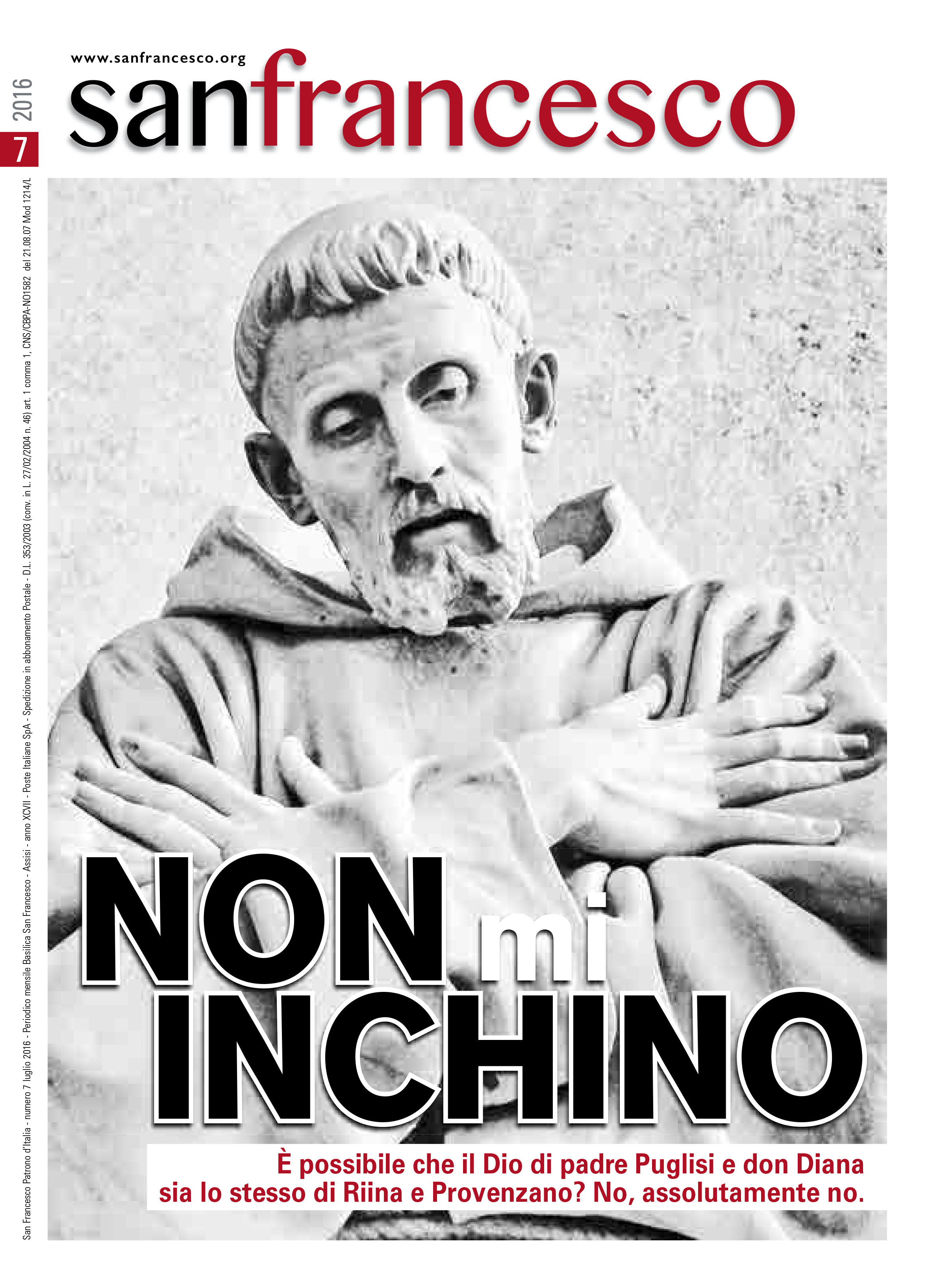 ASSISI (PERUGIA), 14 LUG – “La sosta davanti alla casa del boss e l’inchino delle statue sono segni di sottomissione all’onnipotenza del potere criminale, una sostituzione del Padre col ‘padrino’“. Sono queste le dure parole di Don Ciotti per il numero di luglio della rivista San Francesco dedicato al “rapporto” tra mafia e Chiesa. Il mensile francescano titola “Non m’inchino” condannando la mafia “strada di morte e incompatibile con il Vangelo“. Tra gli interventi: padre Alex Zanotelli, Rosy Bindi, Mons. Depalma e sul sito sanfrancesco.org un’intervista esclusiva a Pif “per contrastare la mafia ci vuole coraggio, ci sono preti che ce l’hanno e quelli che non ce l’hanno“.