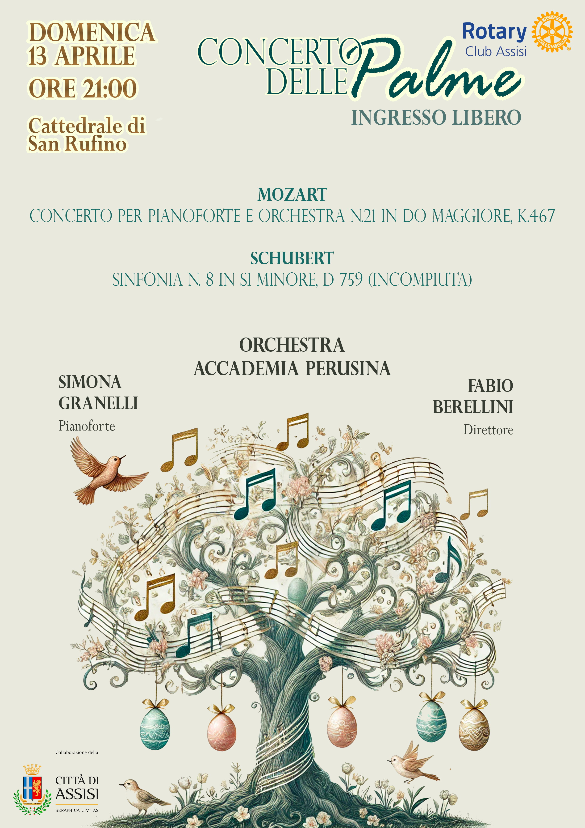 Assisi, 07/04/2025 – Il Rotary Club Assisi, in collaborazione con il Comune di Assisi, è lieto di annunciare l’organizzazione del tradizionale e suggestivo “Concerto delle Palme”, domenica 13 aprile alle ore 21:00 presso la splendida cornice della Cattedrale di San Rufino. Un evento musicale pensato per celebrare i valori universali di pace e fratellanza che da sempre risuonano profondamente nel cuore della nostra città e un’occasione per ribadire come questi ideali siano fondamentali per costruire una comunità più unita e solidale. Il Concerto delle Palme offrirà un programma musicale emozionante che andrà da Mozart a Schubert e che vedrà il maestro Fabio Berellini dirigere l’Orchestra dell’Accademia Perusina e la pianista Simona Granelli. Tutta la cittadinanza è invitata a partecipare a questa serata speciale: un’opportunità per vivere insieme un momento di armonia e per riaffermare l’importanza di costruire un futuro all’insegna della pace e della fratellanza.