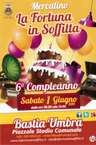 Il primo sabato di giugno ricorre il 6° compleanno del mercatino “La fortuna in soffitta”, evento interamente dedicato al collezionismo e al piccolo antiquariato, al modernariato e al vintage e a tutti coloro che sono appassionati di oggetti appartenuti alla generazione dei nonni o dei genitori. “La fortuna in soffitta” svalica il grande traguardo delle 300 presenze nella giornata del sabato in cui operatori locali regionali e a volte anche extra regionali si sono dati appuntamento nel piazzale antistante lo Stadio Comunale di Bastia Umbra. Il fine dell’iniziativa, negli obiettivi degli ideatori, non era solo quello di consentire un’entrata economica agli operatori economici ma anche di mettere in atto una forma di riutilizzo ecologico di oggetti ancora utilizzabili evitandone così la distruzione. L’appuntamento è per sabato 1 giugno dalle 6.00 alle 13.00 nel piazzale dello Stadio Comunale “Carlo Degli Esposti” di Bastia Umbra.