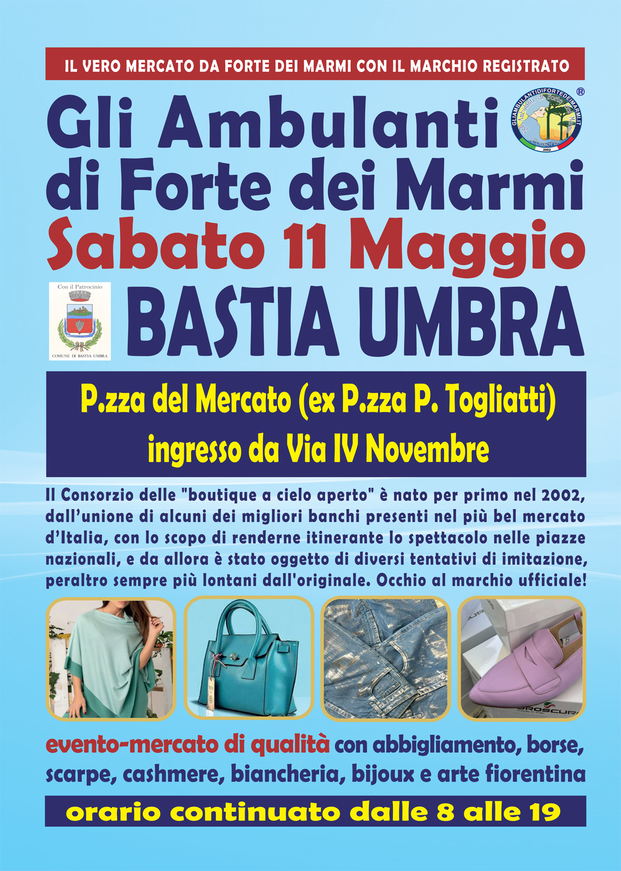 Saranno sabato 11 maggio a Bastia Umbra, in Piazza del Mercato (ex Piazza P. Togliatti) con ingresso da Via IV Novembre, con orario continuato, anche in caso di maltempo, dalle 8 alle 19.