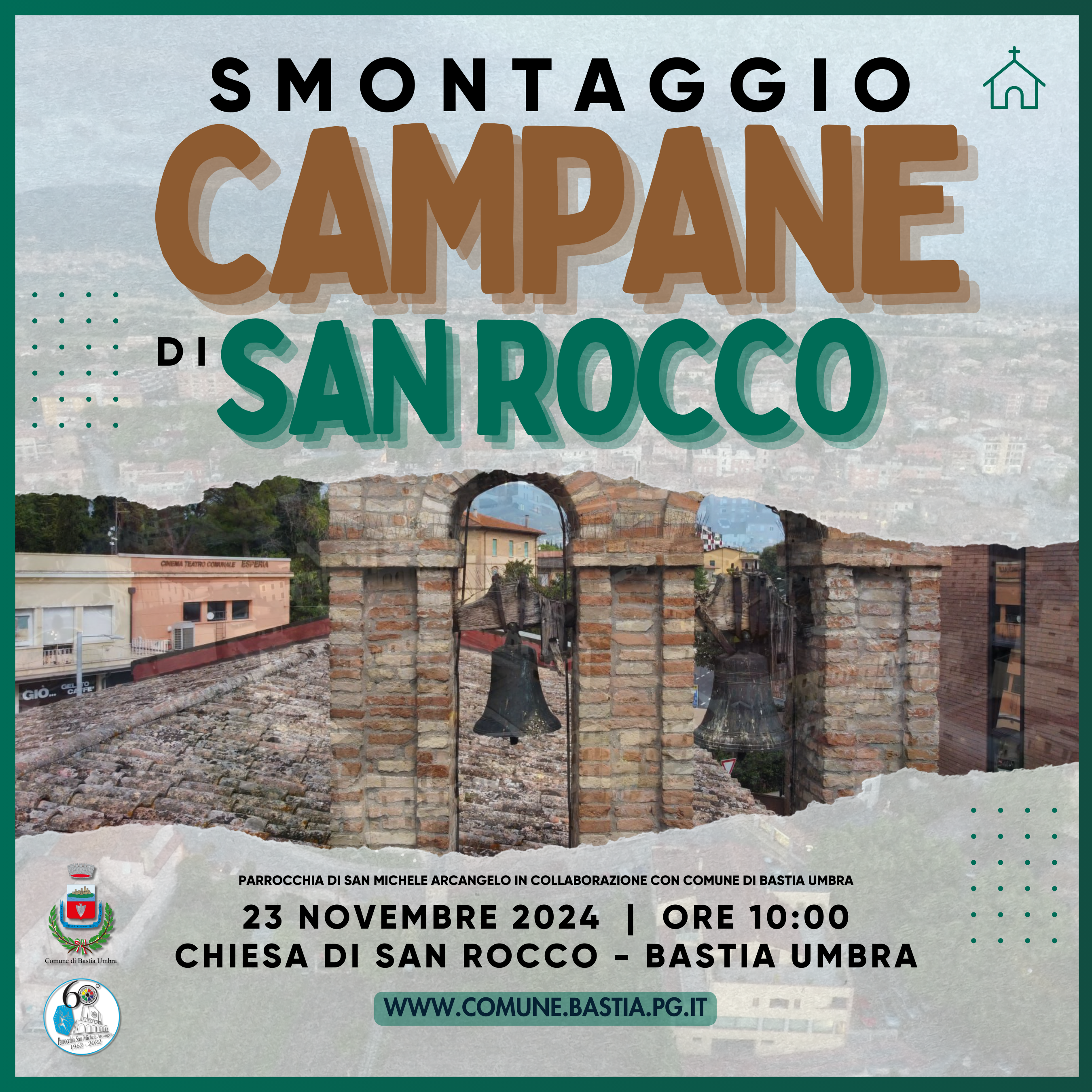 Il Comune di Bastia Umbra e la Parrocchia di San Michele Arcangelo sono lieti di invitare i cittadini ad assistere allo smontaggio delle campane della Chiesa di San Rocco Sabato 23 Novembre dalle ore 10:00.