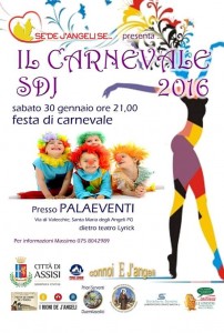 SABATO 30 gennaio 2016, presso il Pala Eventi di Santa Maria degli Angeli, a partire dalle ore 21,00, avrà luogo la Festa di Carnevale organizzata dalle associazioni di Santa Maria degli Angeli in collaborazione con la Città di Assisi. L’evento ha finalità benefiche per questo auspichiamo che possano partecipare in tanti. Sono previsti balli, frappe e strufoli per tutti.