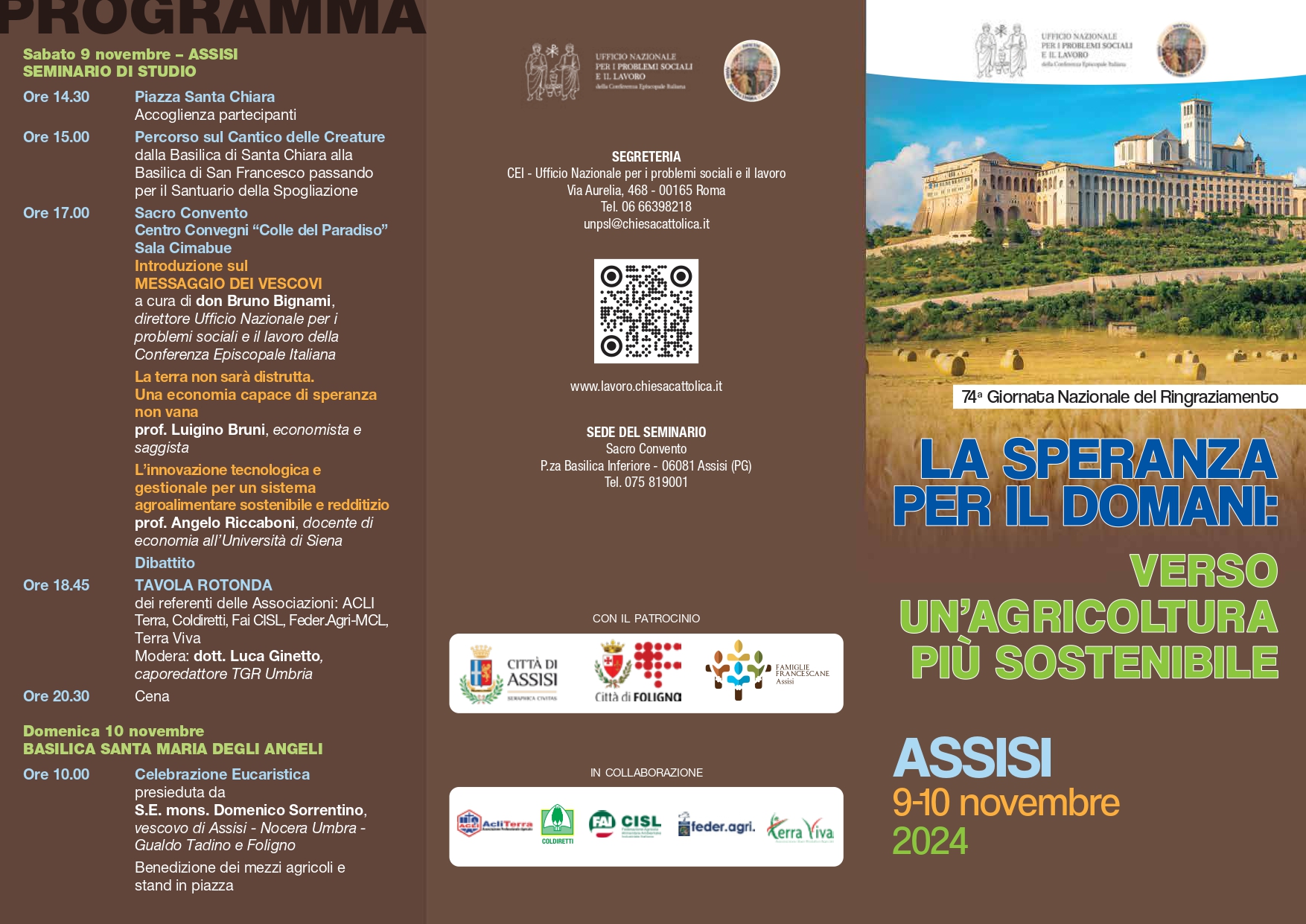 La 74ª Giornata sarà preceduta, sabato 9 novembre, da un incontro presso il Sacro Convento di Assisi: si inizia alle ore 15 con il “Percorso sul Cantico delle creature”, dalla Basilica di Santa Chiara alla Basilica di San Francesco passando per il Santuario della Spogliazione. Alle ore 17 si terrà un seminario di studio: ad introdurre i lavori sarà don Bignami che si soffermerà sul messaggio dei vescovi per la Giornata; seguiranno gli interventi di Luigino Bruni, economista e saggista, e di Angelo Riccaboni, docente all’Università di Siena. Dopo il dibattito, è prevista una tavola rotonda a cui parteciperanno i referenti di diverse associazioni. Domenica, alle ore 10, il vescovo Sorrentino presiederà la celebrazione eucaristica nella Basilica di Santa Maria degli Angeli, al termine della quale è in programma la benedizione dei mezzi agricoli e degli stand allestiti in piazza.