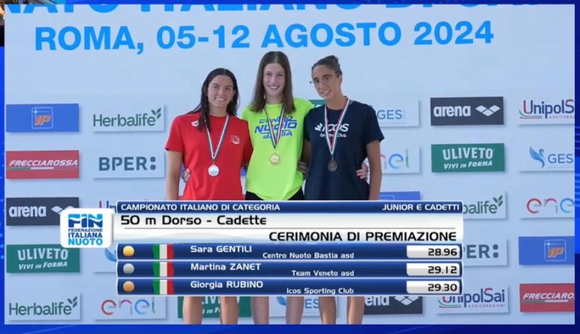 Una medaglia d’oro nei 50 dorso nella categoria cadette che, con un tempo di 28’’96, le fa anche siglare il nuovo record regionale!