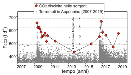 L’analisi di dieci anni di campionamento di CO2 disciolta nelle acque delle falde appenniniche ha mostrato la sua massima concentrazione in occasione di intensa attività sismica