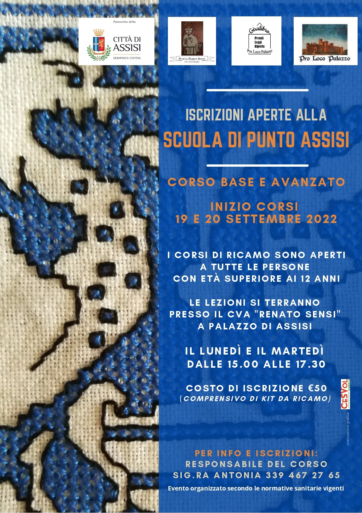 Dal 27 settembre al 6 ottobre ci sarà anche un’esposizione e dimostrazione di ricamo punto Assisi alla sala delle Logge e una mostra mercato a Santa Maria degli Angeli oltre a iniziative in tutto il territorio. Per tutte le informazioni è possibile contattare la referente Antonia Zampini al numero +39 339 467 2765 e per rimanere sempre aggiornati è possibile seguire le pagine Facebook (e Instagram della Scuola Punto Assisi – Palazzo.