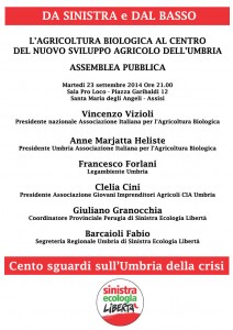 Per conoscere meglio tutti i temi legati all’agricoltura biologica, con particolare attenzione alla realtà dell’Umbria, il circolo di Assisi di Sinistra Ecologia Libertà organizza una assemblea pubblica martedì 23 settembre 2014, ore 21.00 presso la Pro Loco in piazza Garibaldi 12 a Santa Maria degli Angeli. Un approccio “zapatista” della politica, un camminare domandando ( e soprattutto ascoltando) che accompagnerà del resto tutta la campagna di incontri “Da sinistra e dal basso: cento sguardi sull’Umbria della crisi” e che caratterizzerà l’iniziativa di SEL nella regione per tutto l’autunno.